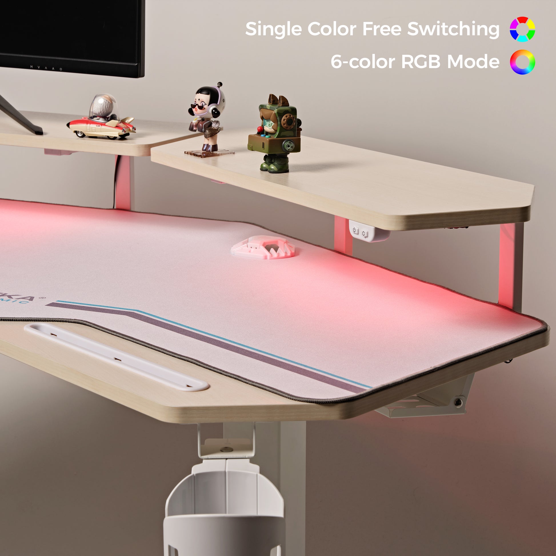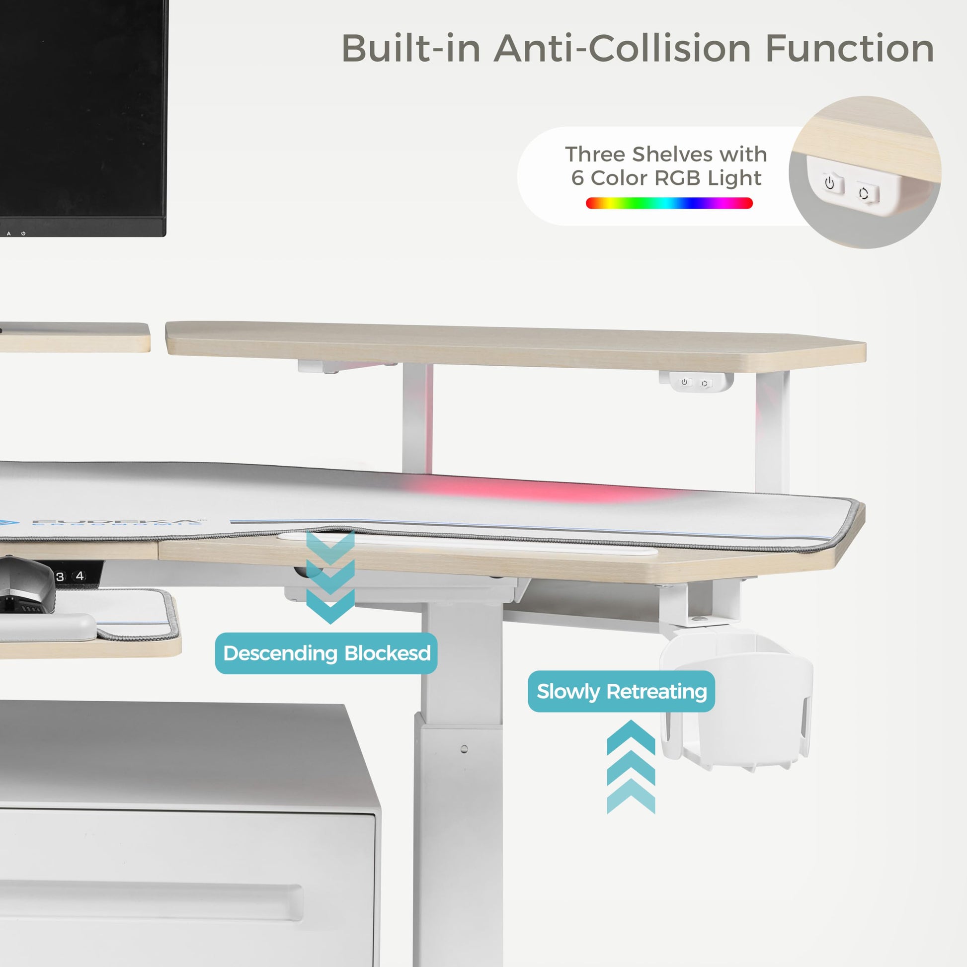 The ultimate standing desk to take you from work to gaming. The spacious 72” surface gives you plenty of room for your dream setup, while LED light strips set the perfect mood from focused work sessions to after-hours gaming. Customizable shelves, advanced features, and bonus accessories make this desk the real MVP.