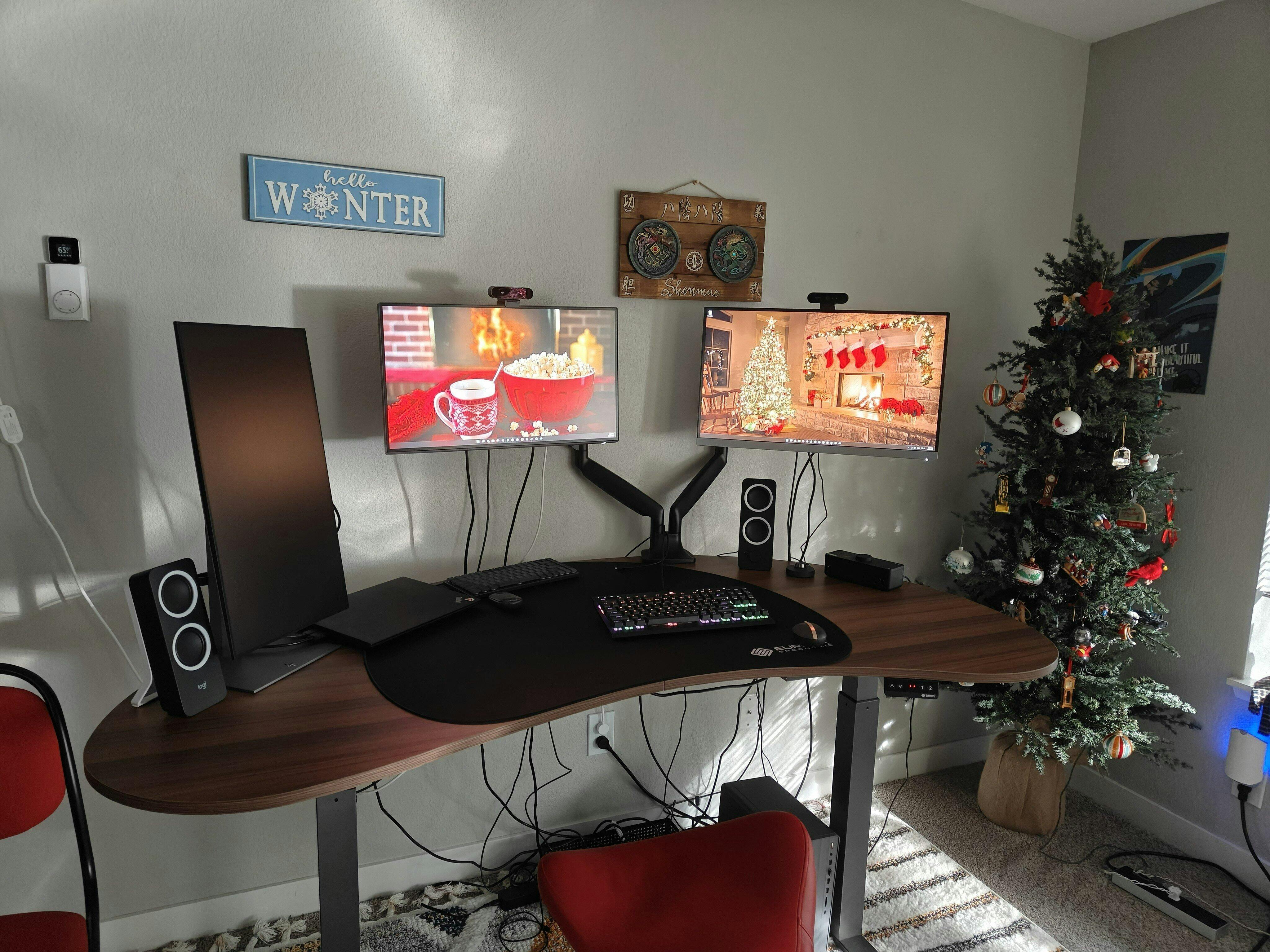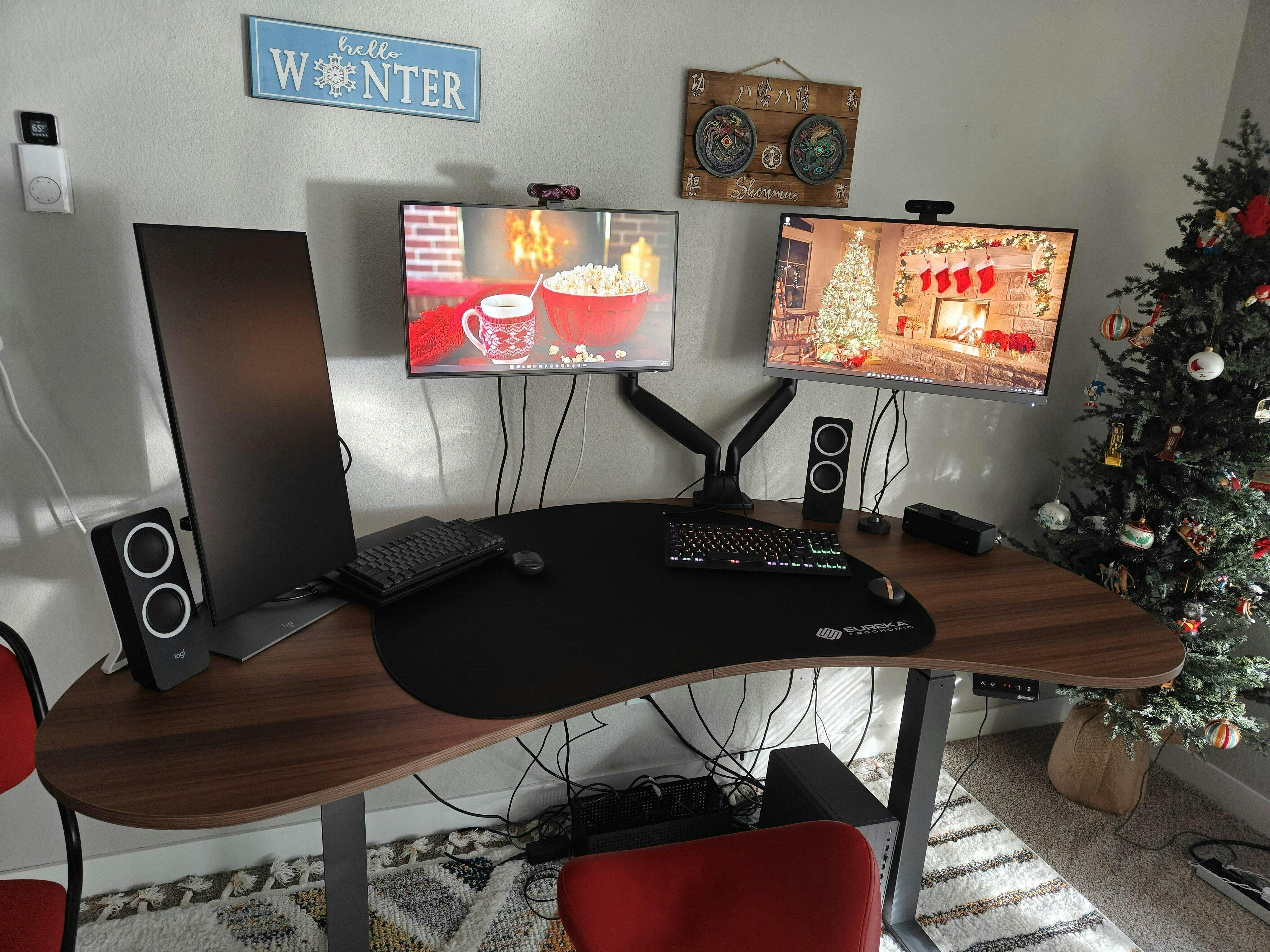 This desk has made a huge upgrade to my work from home setup / personal computer station. There is abundant space for three monitors and spare peripherals without introducing any clutter. The left monitor is just for work, the right is for my personal desktop, and on the middle I toggle inputs to serve both.