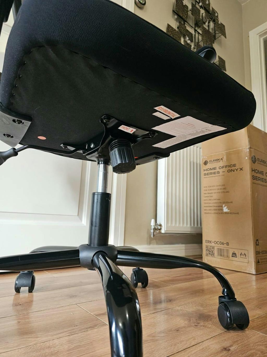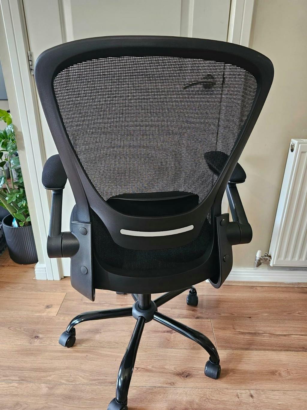 This office chair comes flat packed so some basic assembly is needed. You get everything you need inside the box including the fixing tools. I competed the assembly on my own and it took me around 30 mins, i found the instructions to be fairly clear and accurate. Once assembled the chair looks super smart. The seat cushion is a little hard at first, but i suspect once it has been used for a few weeks it will soften up. The back is a really comfortable mesh which allows for air to circulate around your body. At the bottom of the back rest is a lumber support cushion which flexes as you move - i really liked this addition as i felt like the bottom of my back was well supported. The arms are good quality and have small cushion pads. They also rotate fully backward so we were able to slide this under out small office desk without issue. The chairs height and position can be fully adjusted using the arms underneath the seat.