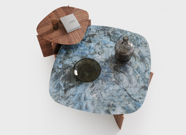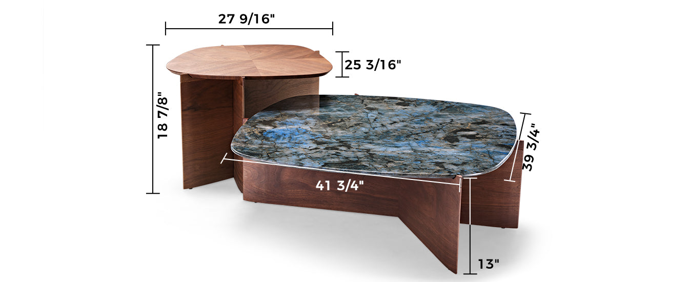 Add a touch of sophistication to your living space with the CT04 Coffee Table. The table features an irregular blue jade marble top nested within a walnut wood frame, creating an eye-catching contrast. The 2-piece design allows you to configure the table to fit any area, enhancing its functionality. With its clean lines and chic aesthetic, this marble-topped coffee table is the perfect addition to any modern home.