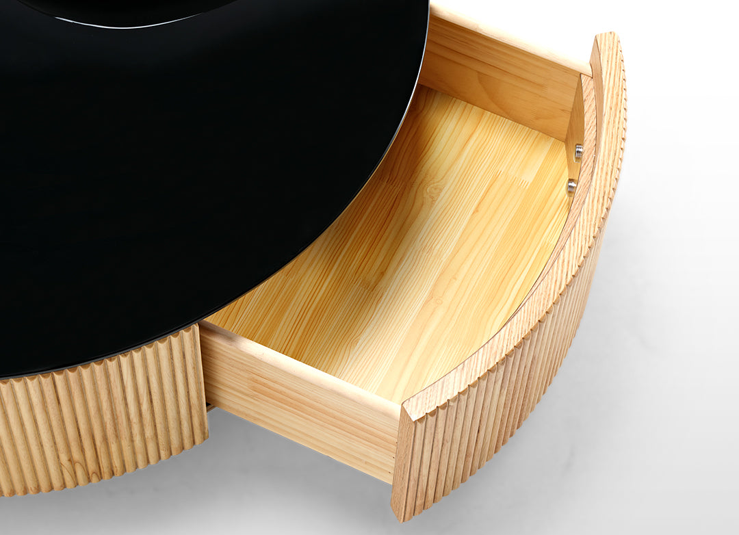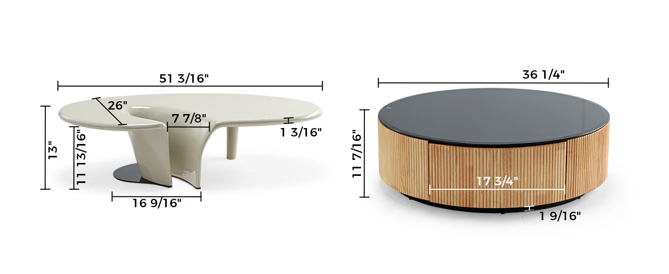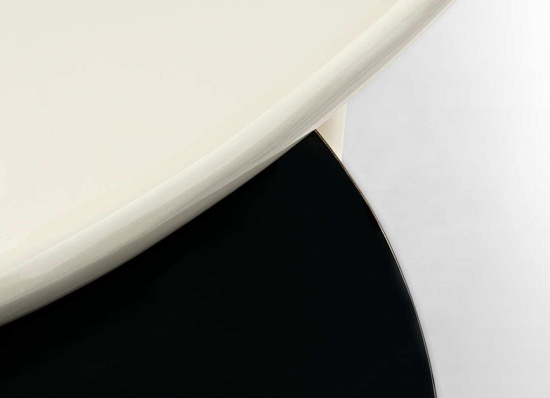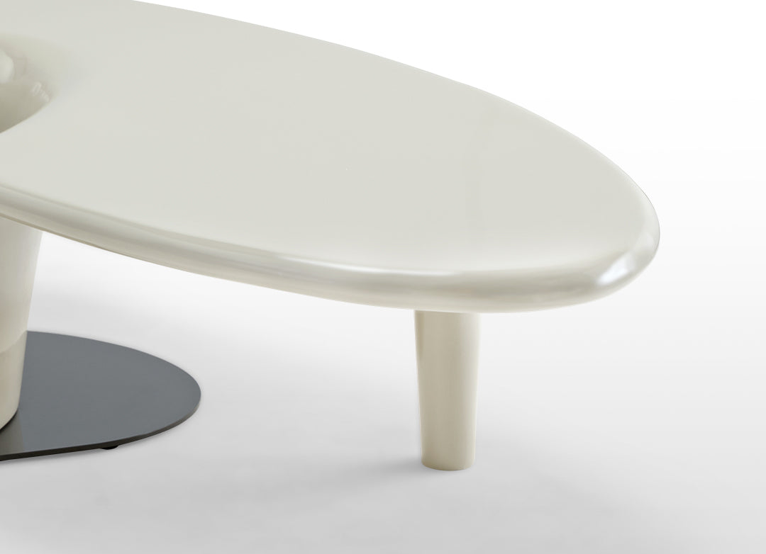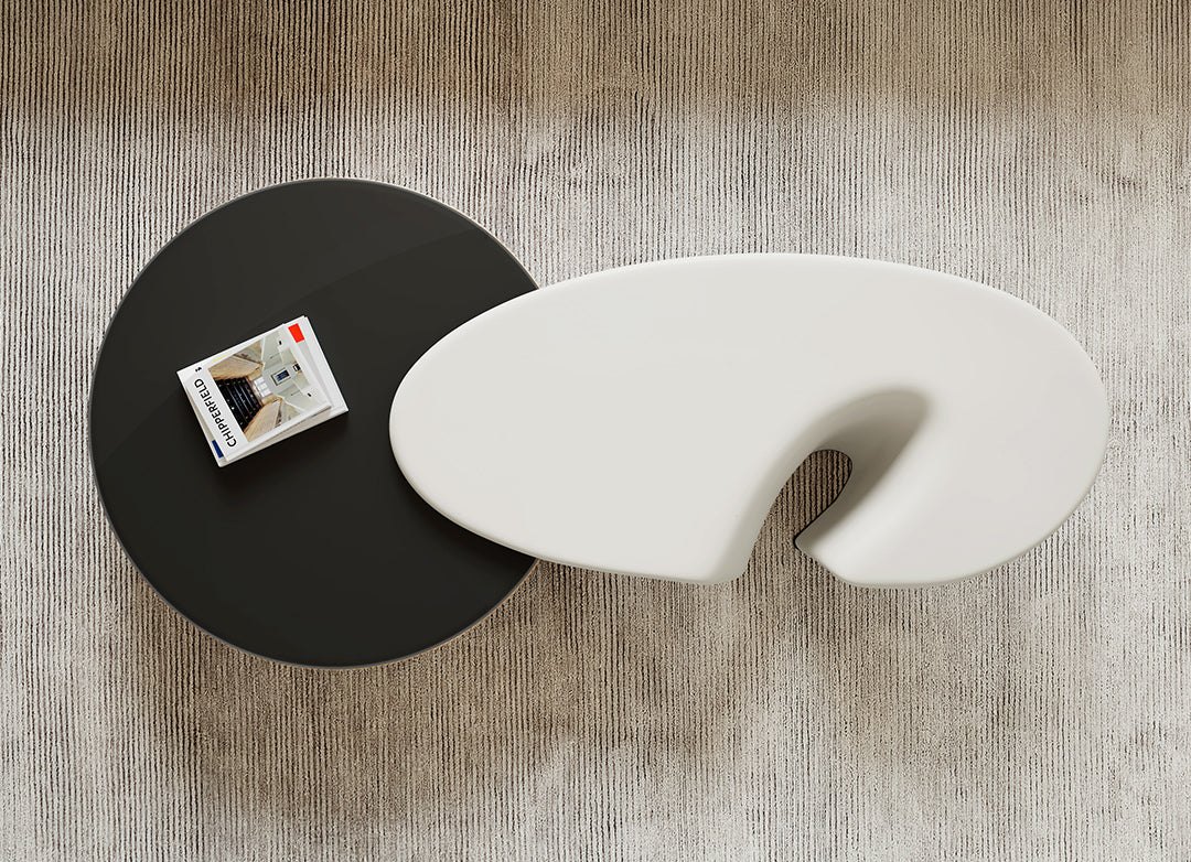 This striking design instantly becomes the centerpiece of your living space, featuring a blend of elegance and innovation. With its juxtaposition of a sleek, white, uniquely shaped coffee table nestled atop a bold, black, circular base, it adds a touch of sophistication to your home décor.