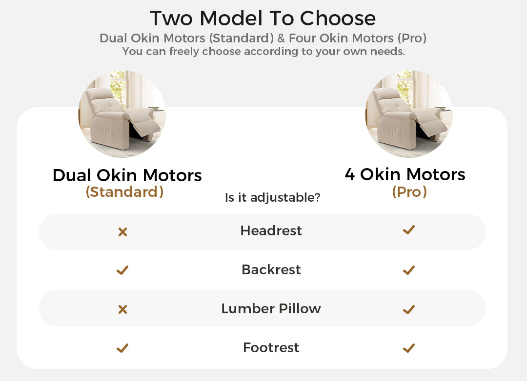 The Dual Okin Motors (Standard) has an adjustable backrest and footrest, while the Four Okin Motor (Pro) can additionally adjust the headrest and lumbar pillow to provide more comprehensive support adjustment. Which type of recliner you choose depends on your personal needs for comfort and functionality.