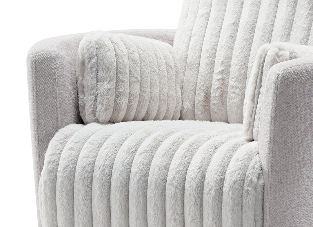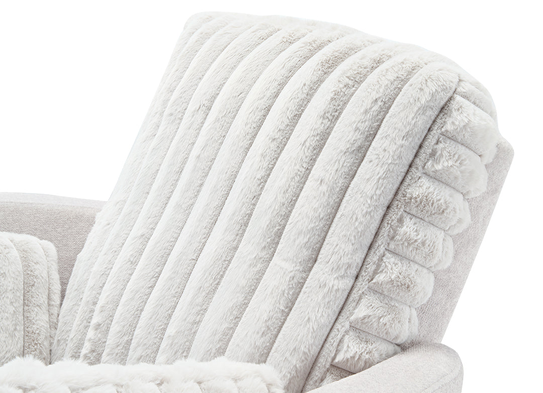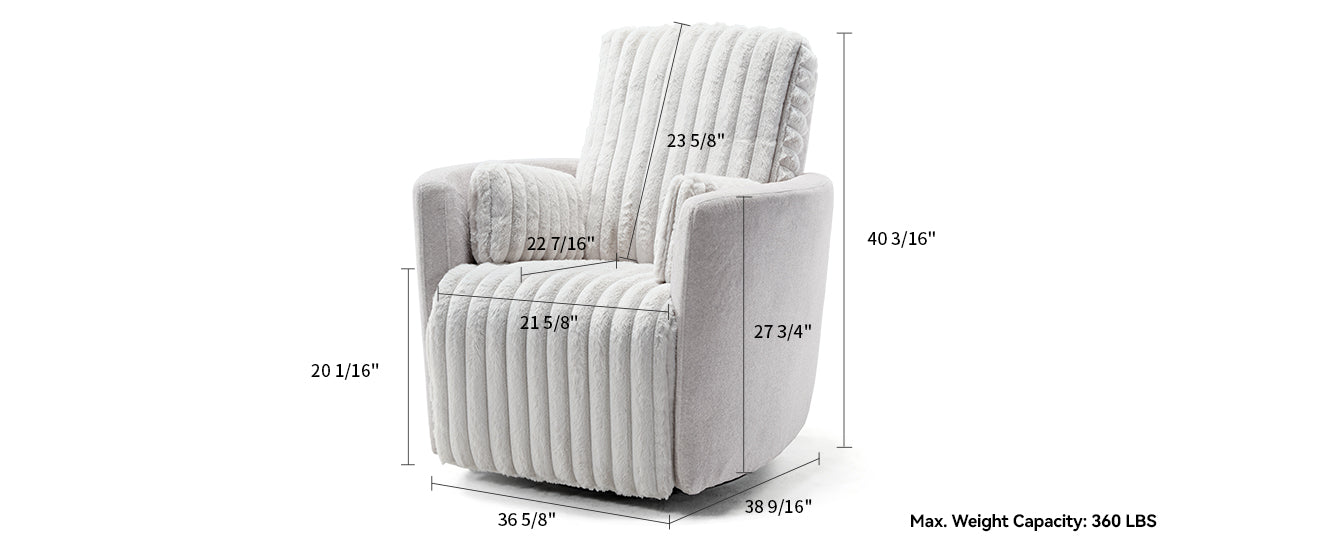 - Elegant Faux Mink Fabric: This Swivel Rocking Recliner is crafted with a sophisticated faux mink fabric fabric that offers a sumptuous and cozy experience, inviting you to sink into its luxurious cushioning and unwind after a long day.