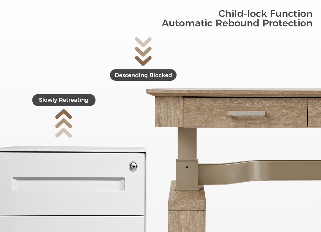Built-in safety sensor detects items under your desk and immediately freezes motion to prevent damage and injury.