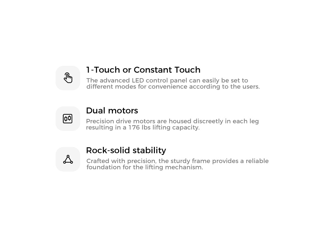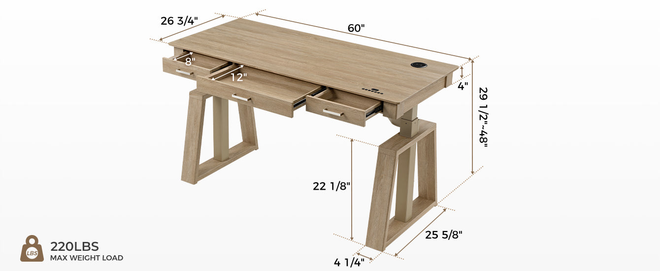 - Adjustable Height, Lift Stability: Height adjusts smoothly between 29.5" and 48" with 2 programmable settings. The advanced dual-motor system lifts up to 220 Ibs. quietly and evenly, supported by sturdy 2-stage trapezoidal legs.