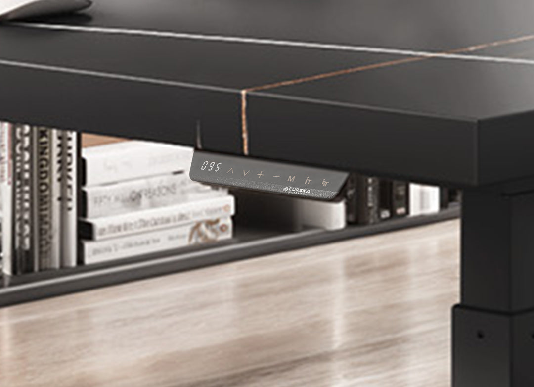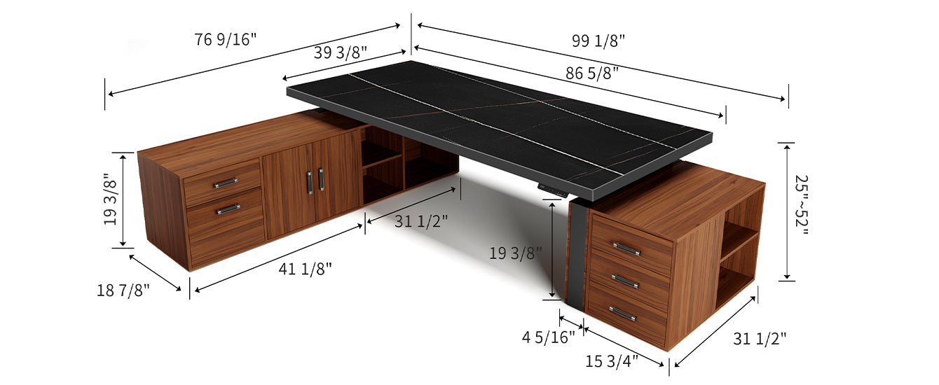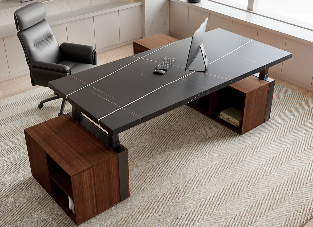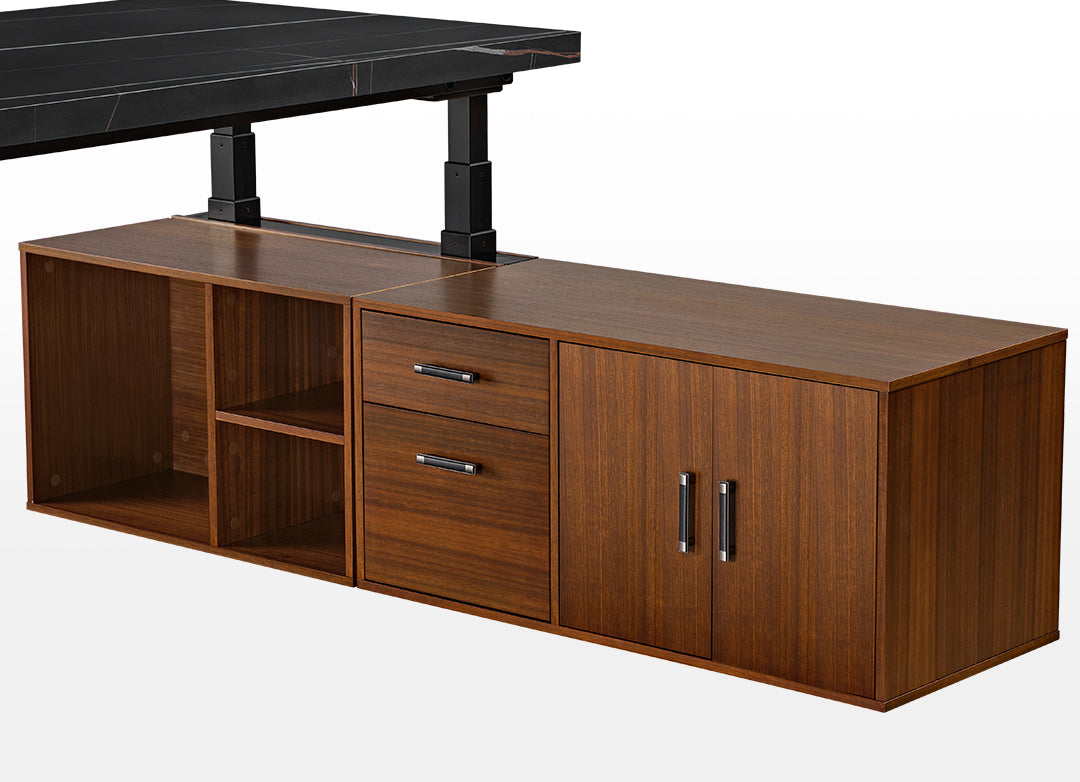 The Luxurious Zen Executive standing desk comes in a modern luxury design that integrates a Black Gold Sintered Stone desktop with side cabinets. The Desk adds a sense of luxury to any office setting. This premium standing desk boasts a high-end, advanced four-motor lift system, providing you with the flexibility to switch between sitting and standing positions whenever you desire seamlessly.