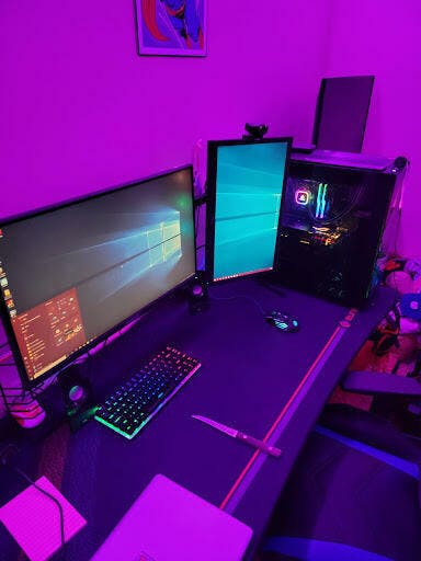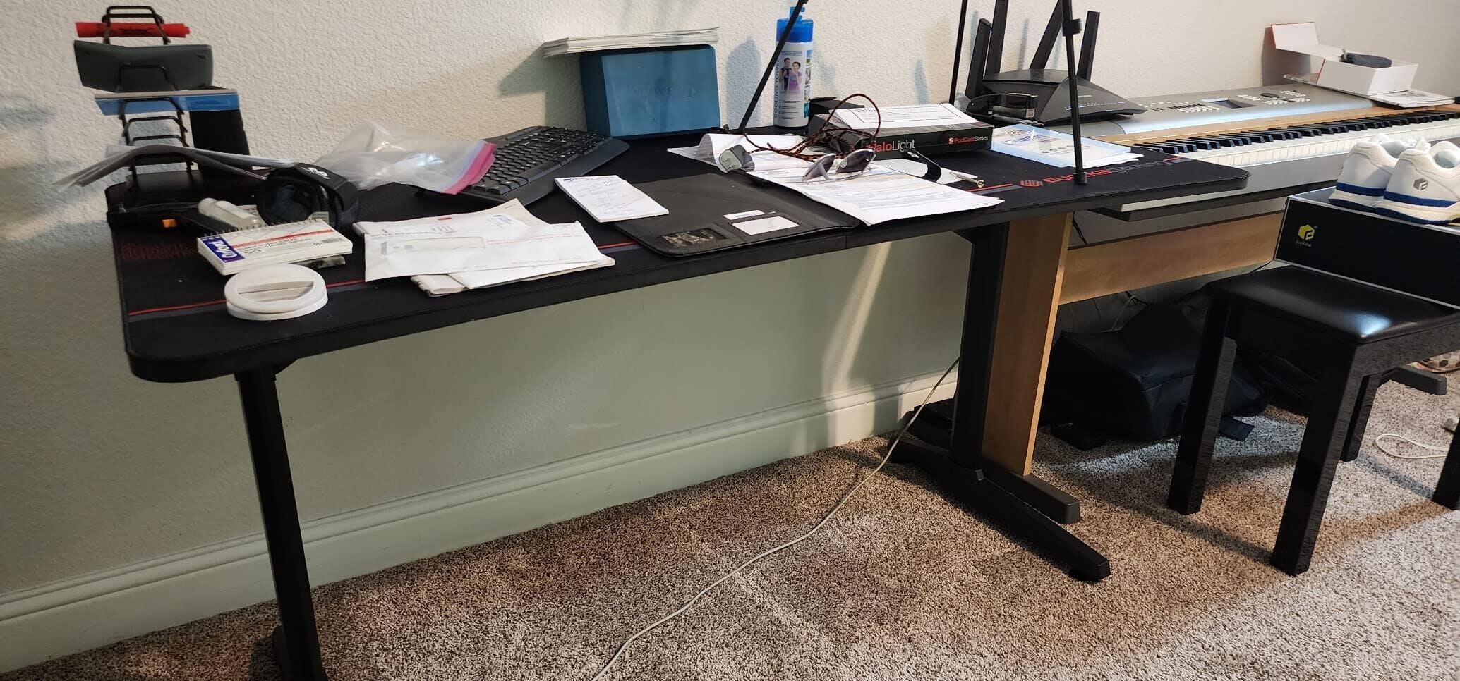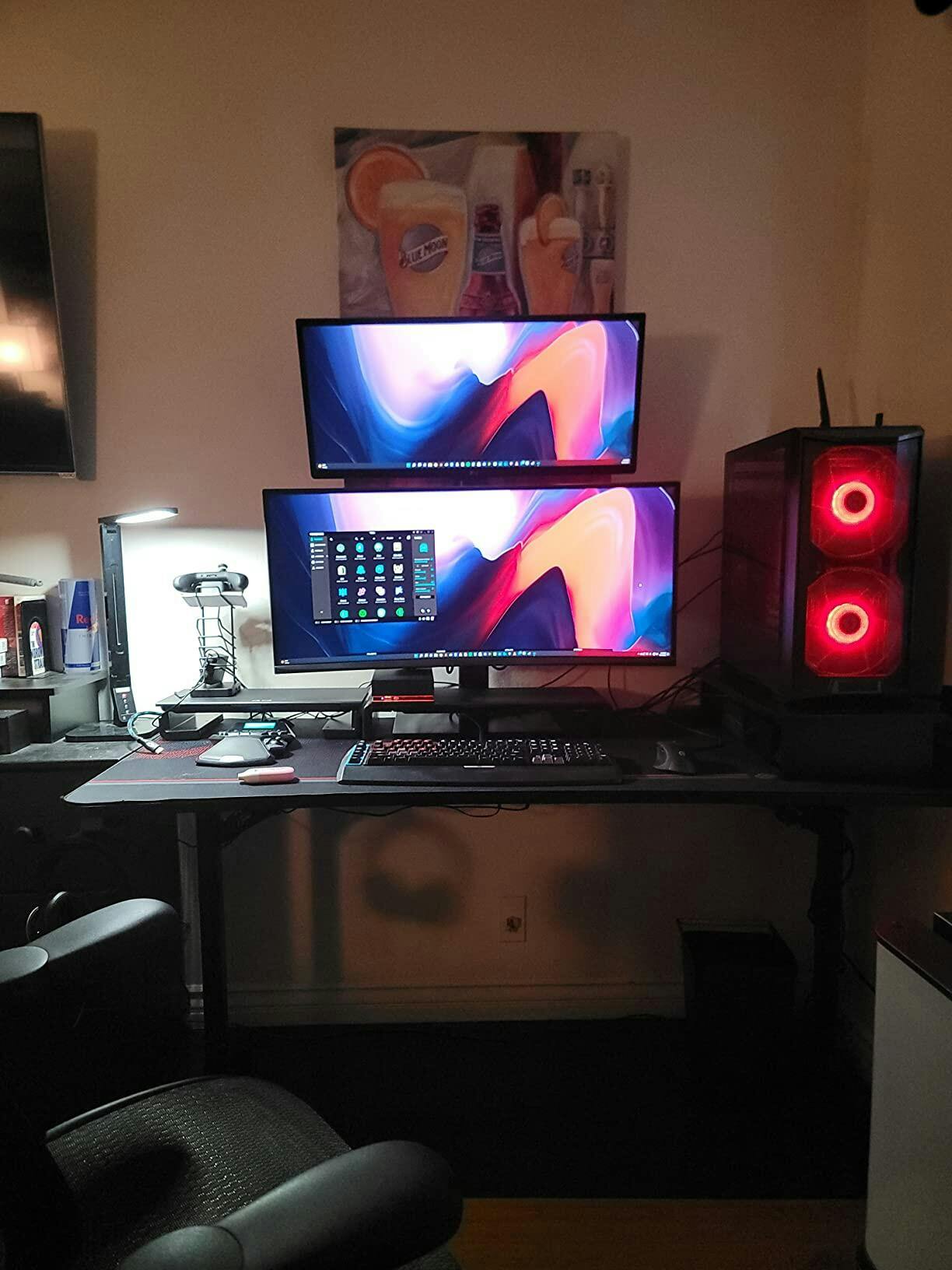 Long story short, I was still using a desk I build in High School woodshop in 2003 as my primary gaming/work desk. I built the thing way too tall and it was just awkward and uncomfortable. I finally decided to let it go 17 years later (its now a storage cabinet) and buy a proper desk. See pic.I love the mouse pad covering the whole top, makes a very nice surface with plenty of room to swing your aiming arm.Easy to assemble, good customer service (had to get some extra screws that were missing to finish installing the cupholder and headphone holder that are not pictured), and great product. This is what a 5-star experience should be.Combod with a 3 monitor stand on the desk, a wall mount for the monitor in the top left corner, and the TV just sits on the very large window sill in my basement office (for anyone wondering about the setup)