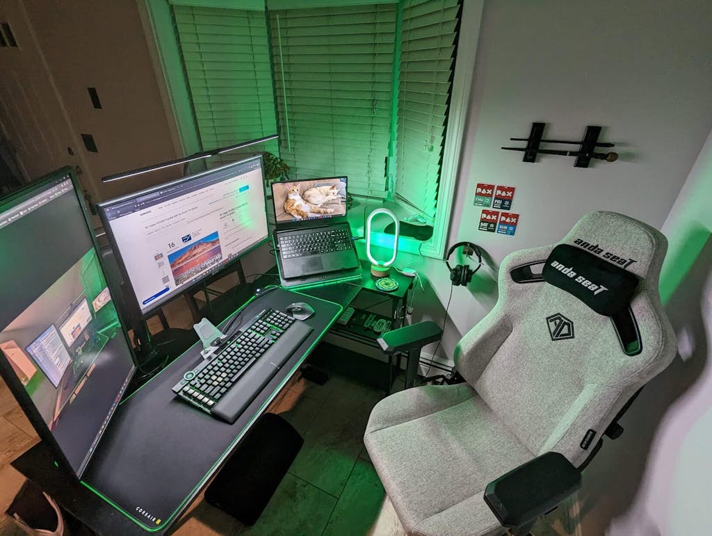 I've been absolutely psyched to create my own home office over the past few months. Back in September of 2022 I came down with COVID, and was unable to go into work. Up until then I had never REALLY worked from home, aside from taking a phone call or two. After the first few days, I began to feel better, but my boss was adamant that if I was still testing positive, I should remain home. Well after the first week, I was still testing positive. I began taking phone calls in between playing Uncharted with my laptop on a coffee table. That arrangement quickly became a major pain, as I was doing all sorts of unintentional yoga to properly type on my laptop. I began to transform my dining room into an office. I started with my laptop on a cheap riser/cooling pad, and an old hand-me-down monitor propped up on a bucket. Over the next few months, I started to really transform my space into a true office. Now, after months of collecting and buying, I'm finally satisfied with the outcome, and it's this desk that really ties everything together.
