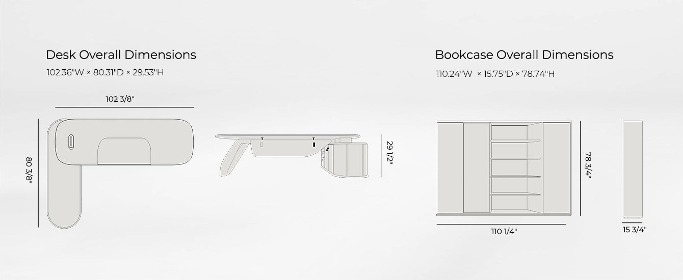 - Desk Overall Dimensions: 102.36"W × 80.31"D × 29.53"H