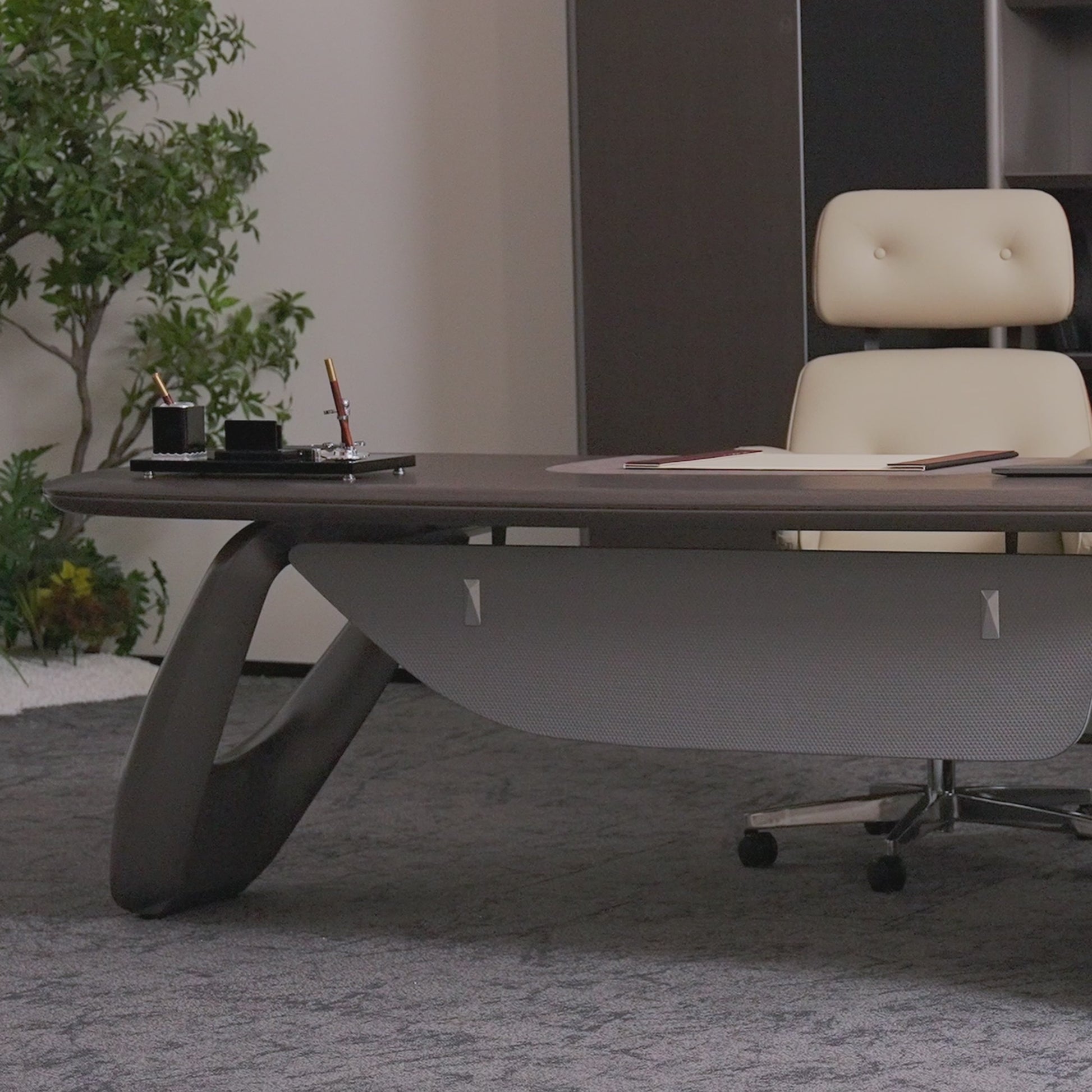 Redefine your executive workspace with the Zen Orion Desk & Bookcase , crafted from rich ink-stained ebony and featuring a sleek curved design, created for CEOs and elite professionals seeking a refined and commanding environment.The thoughtfully designed desktop and storage provide both elegance and practicality.