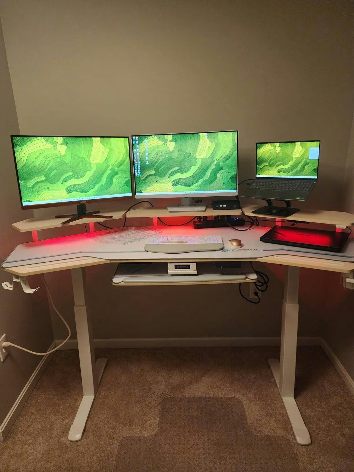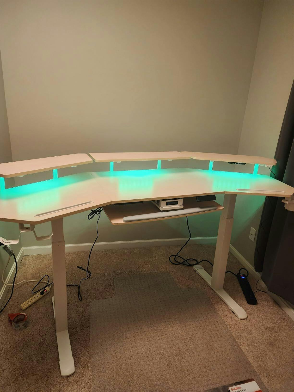 Overall though i am extremely happy with this. I love the design, the color, the extra rgb lights (i also have two light bars so don't take my picture as how bright just the desks are), it just had everything that i had in my mind when looking for the right desk and i couldn't be happier. My last desk was able to fit my personal pc on there but i was not able to with this desk which I actually was not intending to do with this desk. I like being able to see my personal PC (who doesn't) rather than tucking it behind the monitors like i used to have it, so i ended up grabbing the PC cart too which I'm super happy with. The cart gave me a little extra wiggle room for placing my router, my works router and my home security system as well which was normally all out in the open on file cabinet. So that was a nice bonus.