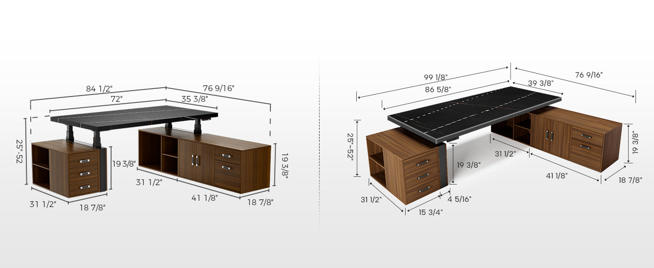 The Luxurious Zen Executive standing desk comes in a modern luxury design that integrates a Black Gold Sintered Stone desktop with side cabinets. The Desk adds a sense of luxury to any office setting. This premium standing desk boasts a high-end, advanced four-motor lift system, providing you with the flexibility to switch between sitting and standing positions whenever you desire seamlessly.