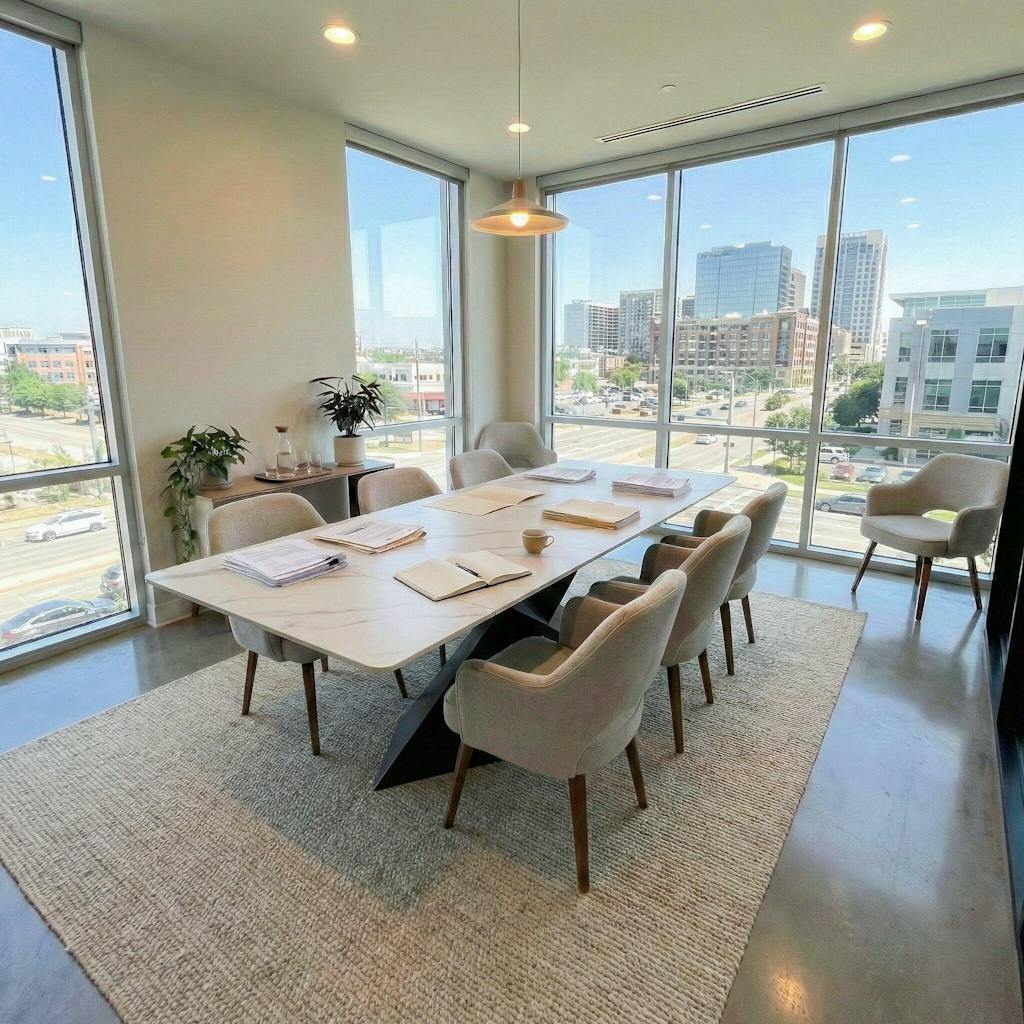 The marble table and minimalist decor create a sophisticated, modern aesthetic, while the functional layout ensures every meeting runs smoothly. The plants add a touch of greenery and life to the space, and the city view never fails to impress our clients.
