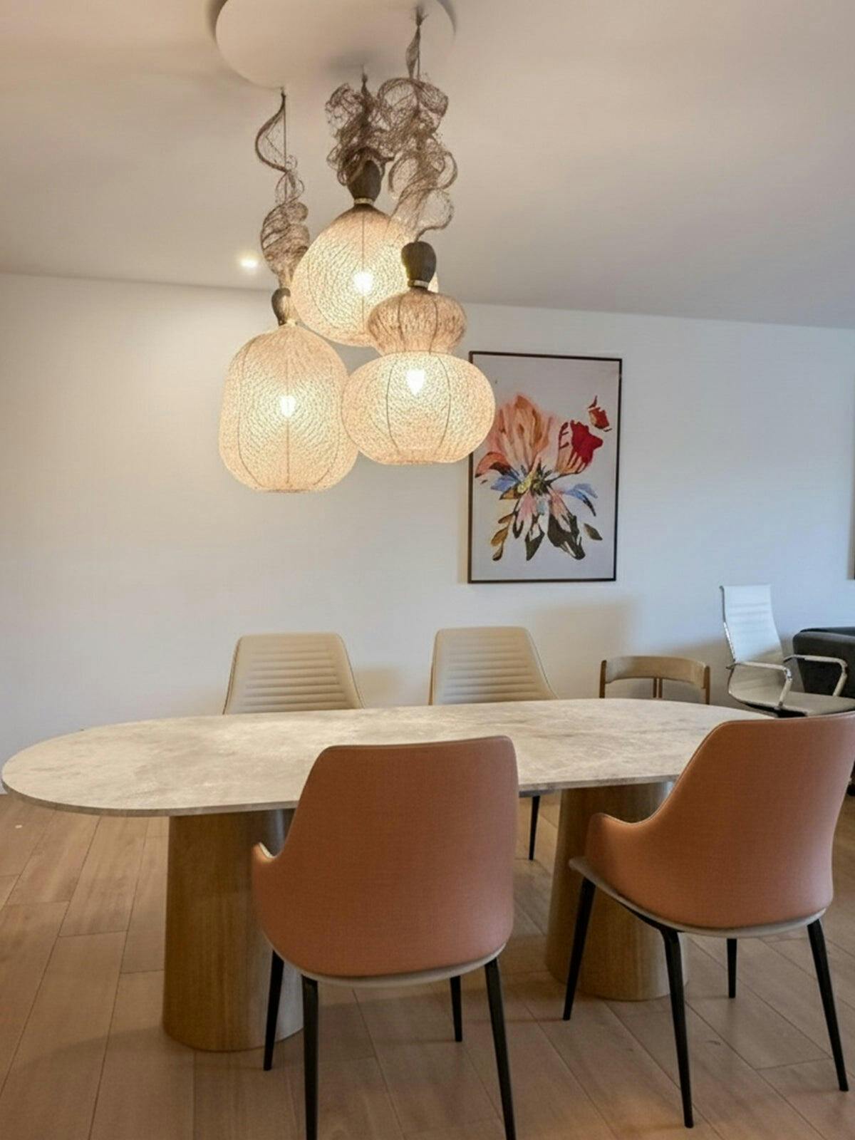 Been using these dining chairs for months now, and they’re still a favorite. The design feels modern and streamlined. Sitting in them is comfy—they’ve got enough cushion to feel good during dinner, but not so much that they look bulky. Also, they play really well with the rest of our decor, like the pendant lights and the art on the wall. Just gives the dining area a relaxed, put-together vibe. Definitely glad we picked these.