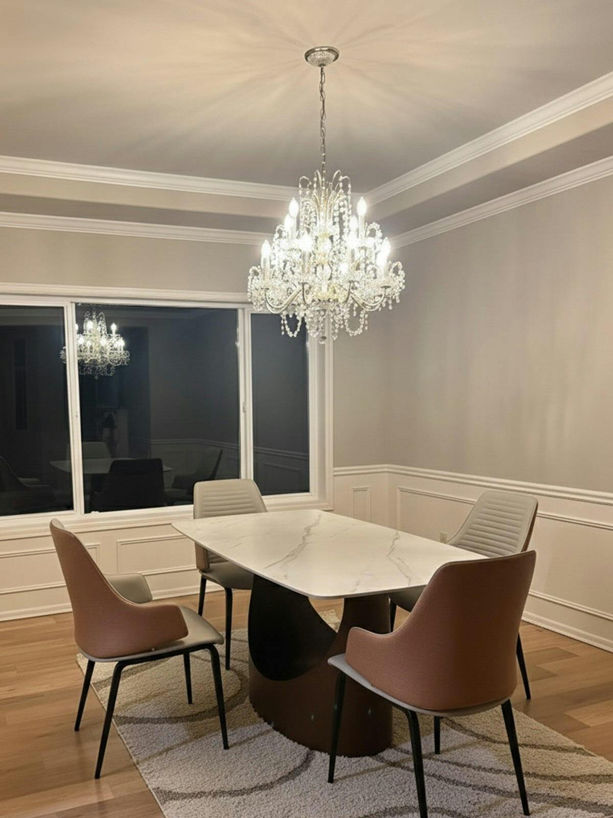 Seriously love how these dining chairs turned out in our dining room. The brown and light gray combo gives off a modern, classy vibe without being over the top. When I sit down, they’re comfy—enough support so you don’t feel like you’re sinking, but still cozy for a dinner party. And they look so good with our marble table and the crystal chandelier. Friends always notice how well they tie the whole space together. Definitely a solid pick.