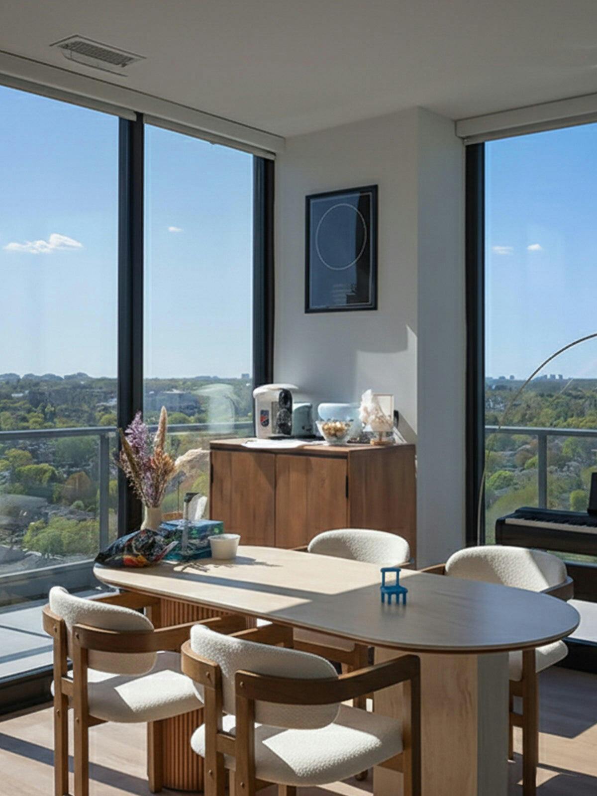 Okay, so I was a little nervous picking out dining chairs for this spot—with the huge windows and the light wood table, I wanted something that felt cohesive. These ones? Total hit. The wooden arms have this clean, simple line that matches the table’s modern vibe, and the cushioned seats are soft but not too sinky—perfect for when I’m sipping coffee and staring at the view. Plus, the way the light hits them in the morning, with the wood tone warming up next to the bright cushions? It just makes the whole dining area feel calm and put-together. I find myself sitting here even when I’m not eating, just ‘cause they’re comfy and the design feels right. Honestly, such a good call picking these.