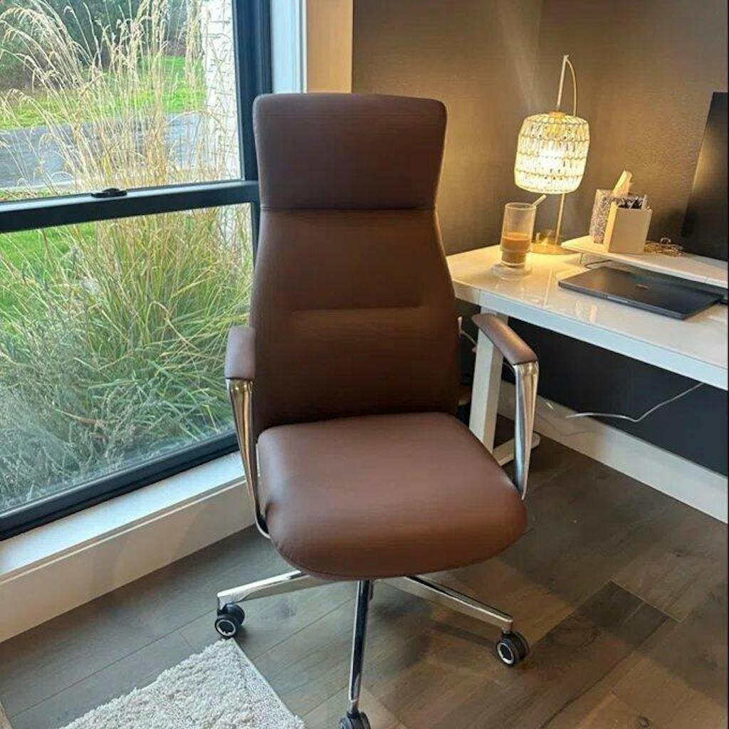 I’m extremely happy with this chair. The craftsmanship is excellent, and you can feel the quality the moment you sit down. The leather is soft and smooth, giving it a very polished, professional look. It definitely feels like a premium chair.