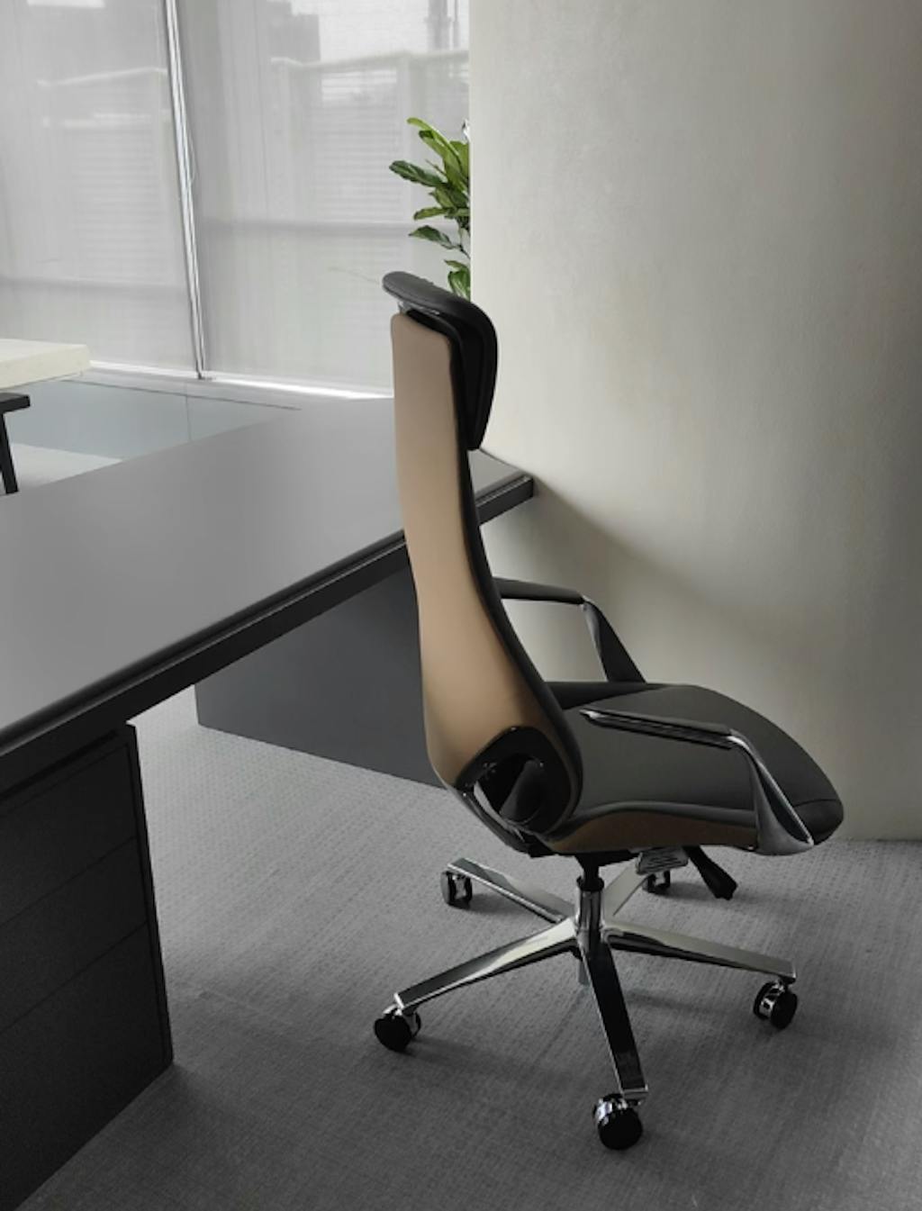 The Serene Aaron commands attention with its deep gray and cognac Napa leather upholstery. Engineered for superior ergonomic support, it features pre-shaped foam cushioning and a contoured lumbar design that molds to your body for unmatched comfort.