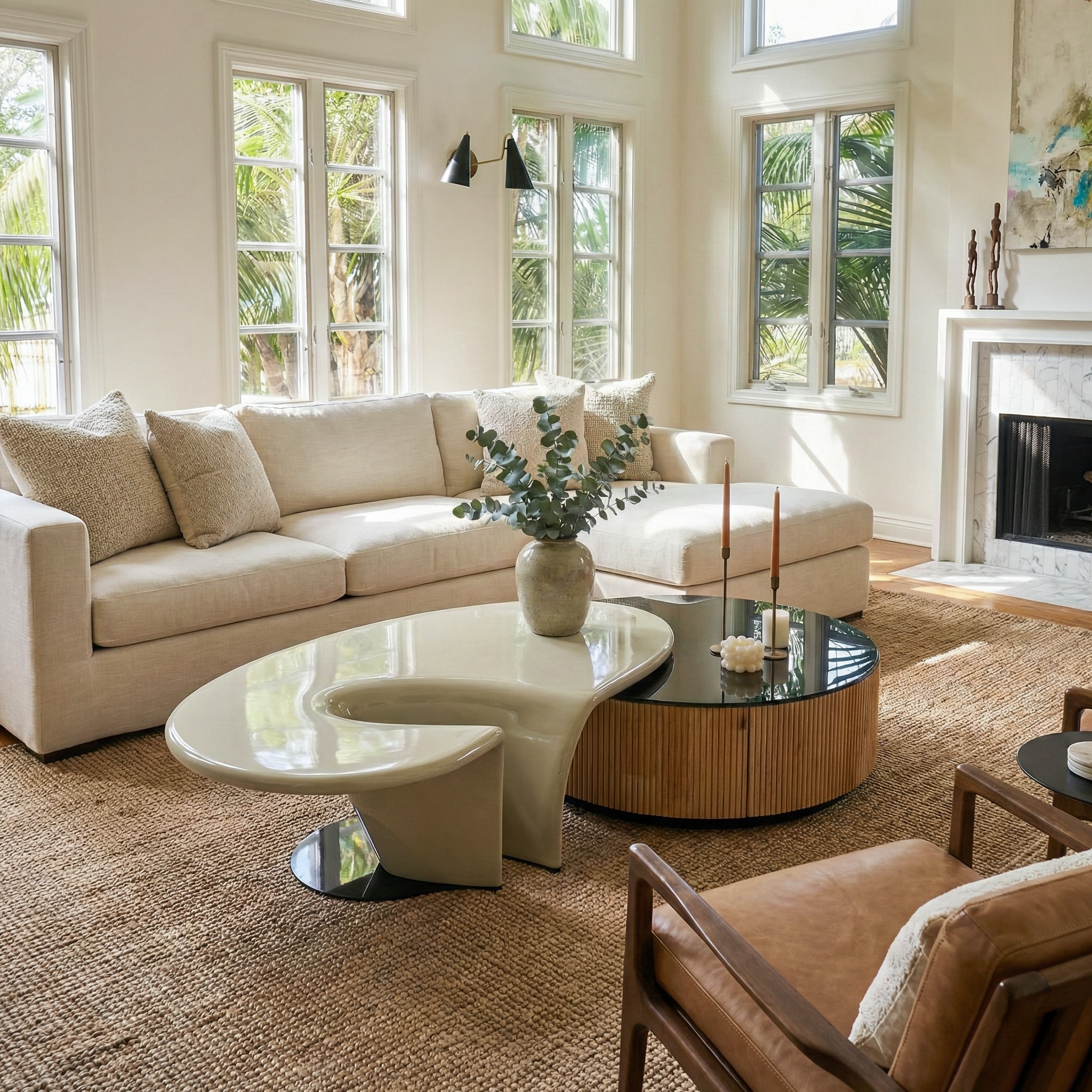 This striking design instantly becomes the centerpiece of your living space, featuring a blend of elegance and innovation. With its juxtaposition of a sleek, white, uniquely shaped coffee table nestled atop a bold, black, circular base, it adds a touch of sophistication to your home décor.