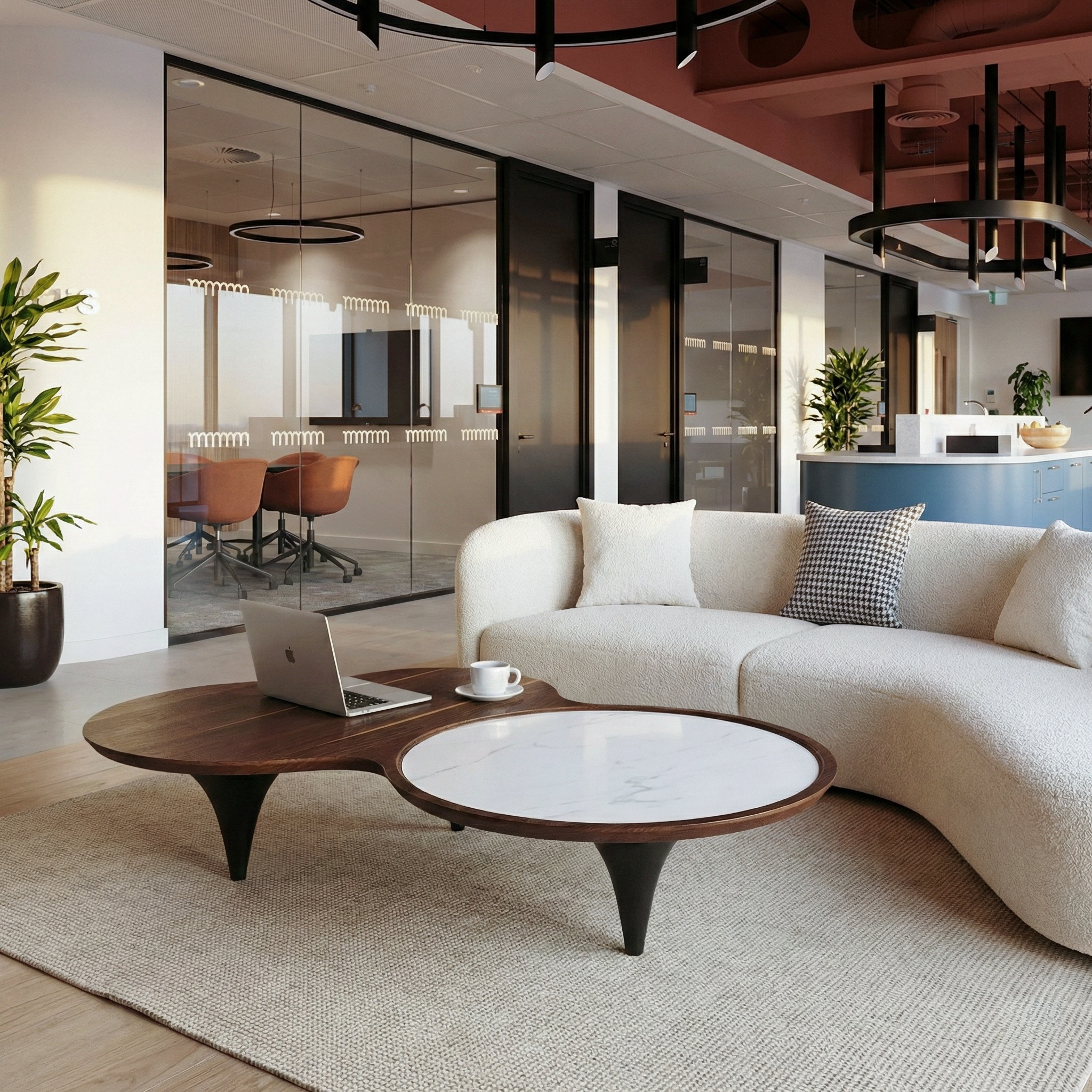 We needed furniture that was professional but not stuffy. The table's unique shape and warm wood-stone combination make a great first impression on visitors.