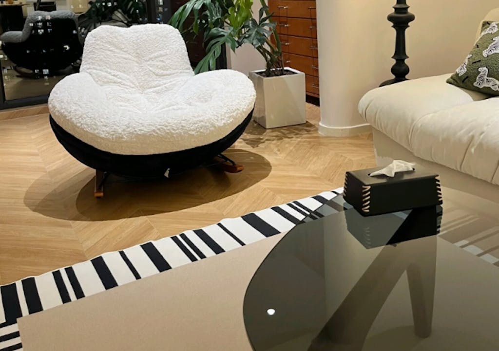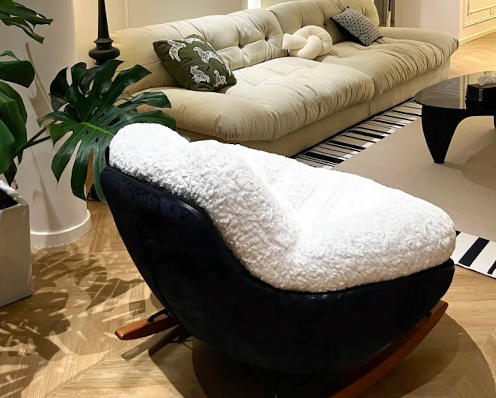 The rocking lounge chair features thick cushion for coziness, perfect for snuggling up with a blanket.