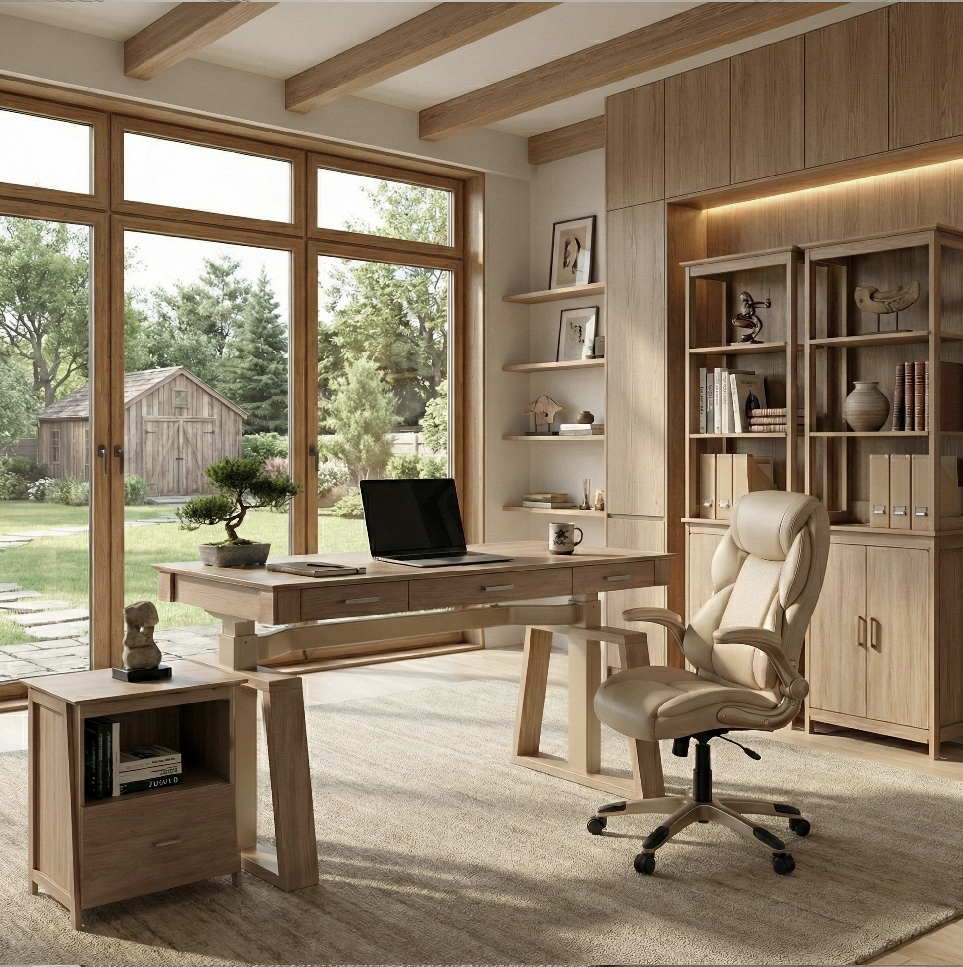 A light-oak office ensemble designed to bring warmth, calm, and effortless harmony to your workspace.Soft neutral tones and gently contoured forms create an inviting atmosphere that supports focus and ease throughout the day.With thoughtful storage and ergonomic seating, the set transforms your home office into a refined, welcoming space made for everyday flow.