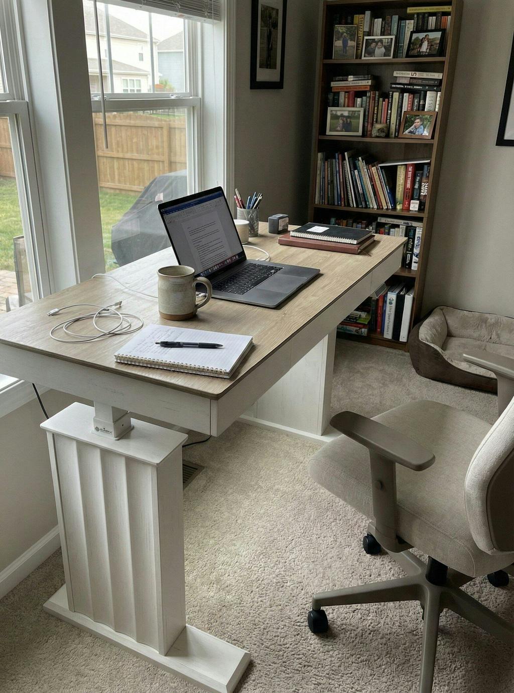 Check out how this desk looks in my home office! I was drawn to the unique fluted legs, but the quality is what really sold me. It’s spacious enough for my laptop and notebooks without feeling cluttered. Switching to standing mode is whisper-quiet, so I can stay focused. It’s not just a desk, it’s a beautiful piece of furniture. Highly recommend for any WFH setup!