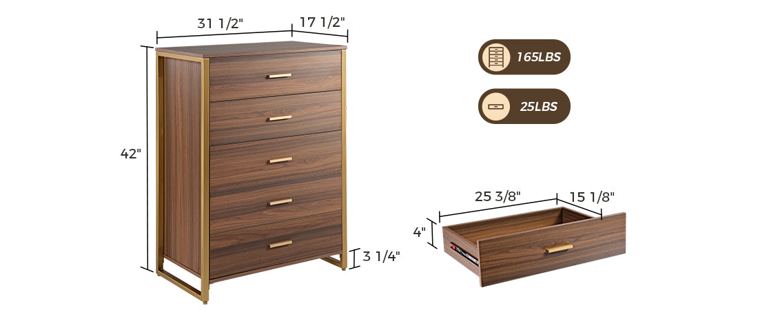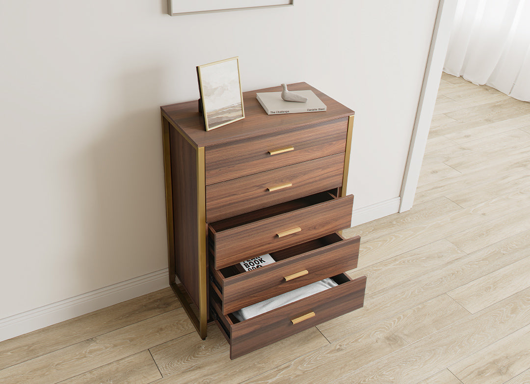 The 5-drawer dresser offers a stylish and minimalist look with extra storage space. It is made of walnut-colored engineered wood in a rectangular shape. The drawers provide ample storage, and the metal base and minimalist pulls complement the modern style. The top surface is perfect for books, table lamps, decor, and friendly succulents.