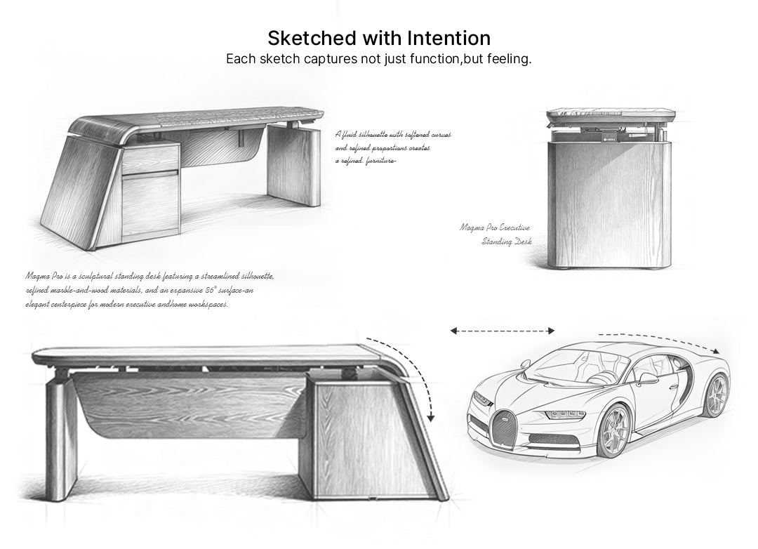 Magma Pro is a sculptural standing desk featuring a streamlined silhouette, refined marble-and-wood materials, and an expansive 86" surface—an elegant centerpiece for modern executive and home workspaces.