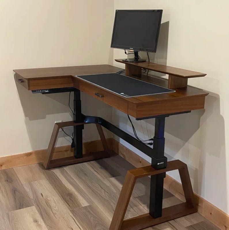 Really needed an L-shaped desk that converted from sitting to standing AND was not super long on both sides. This was perfect! The controls work smoothly drawers are soft close. The wood tone in the photos is true to reality. Only extra nice to have would have been to have some sort of discreet wire management running along the side of the desk - particularly since it must be plugged in for the lift feature to work. Enjoy!!