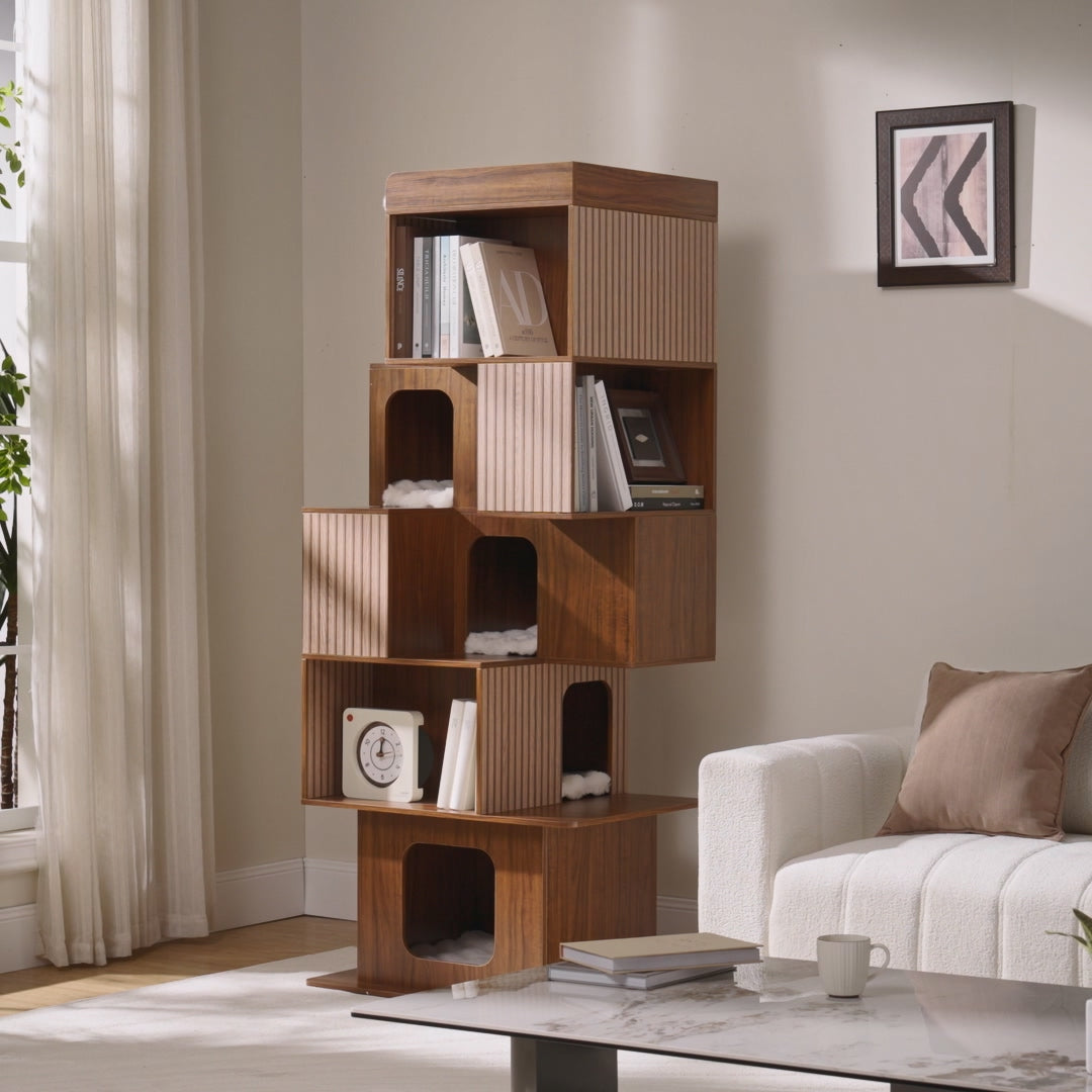 Turn your home into a space you and your cat can both enjoy. The Cat Bookshelf Tower combines modern storage with cozy hideaways, giving your cat spots to climb and rest while you keep your books and decor beautifully organized.