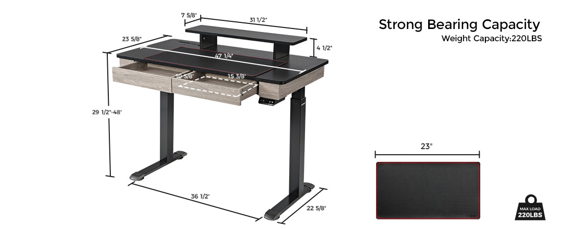 - MORE POWERFUL MOTOR: An advanced electric height-adjustable system with dual powerful motors offers enough strength to lift this 47/55-inch home office desk with dual drawers smoothly and quietly. The built-in HALL SENSOR & Smart CONTROL ensures steady lifting. Max lifting capacity of up to 220 lbs.