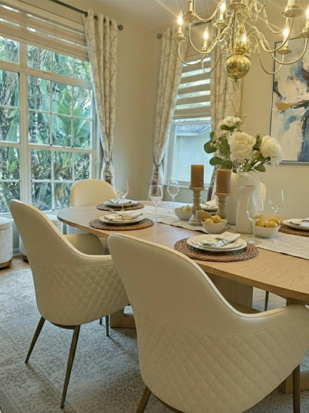 These cream quilted leather dining chairs are such a nice touch for our space. The quilted pattern adds a subtle, classy texture, and the slim metal legs keep things feeling light and modern. When I sit in them, they’re comfy enough for long meals—we’ve had family dinners here that lasted hours, and no one complained about sore backs. The leather feels smooth and durable, too—super easy to wipe down if there’s a little spill (which happens all the time with kids), so they’re perfect for busy family life. They also blend really well with our wooden table, the chandelier, and the natural light from the windows.