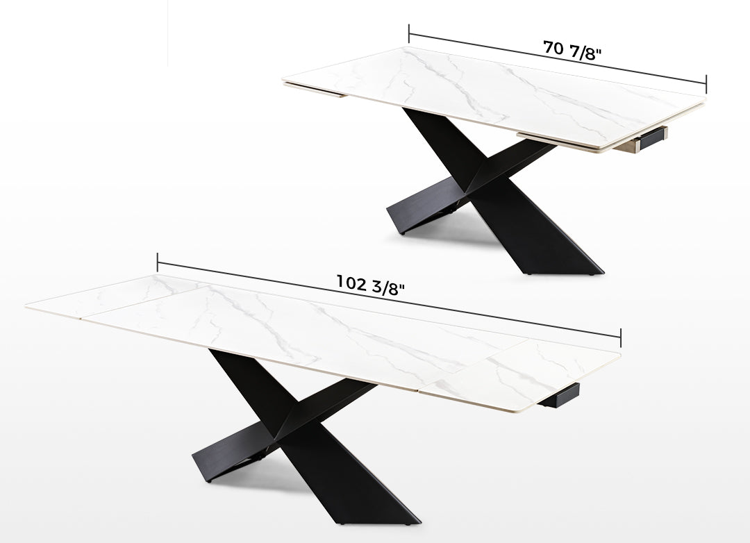 Elevate your dining experience with our Modern Dining Table. The expandable design can accommodate up to 8 guests at your table, perfect for hosting gatherings. The unique X-shaped table legs add a touch of modernity, while the black and white color scheme exudes sophistication. Crafted with high-quality materials for longevity and style.
