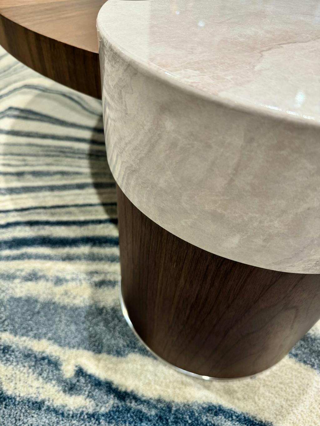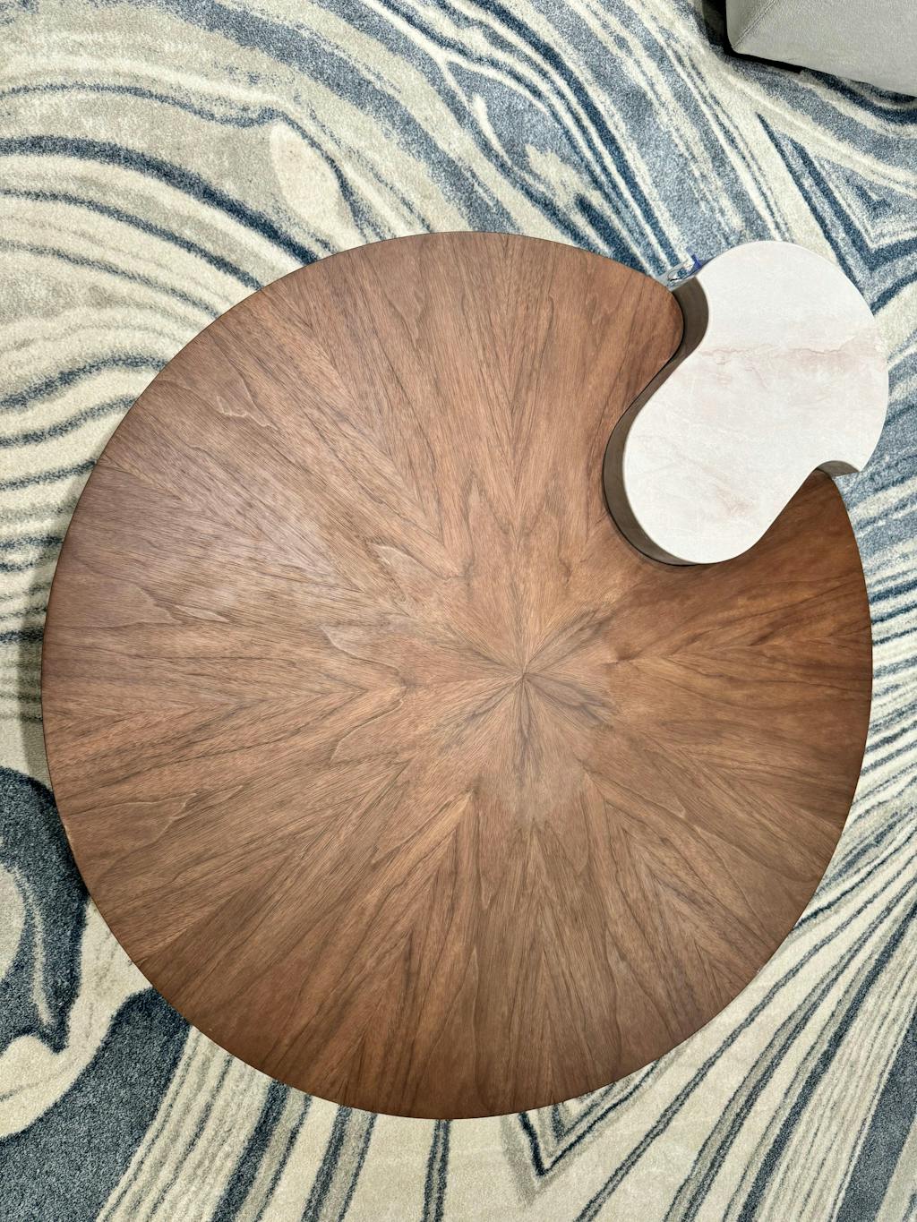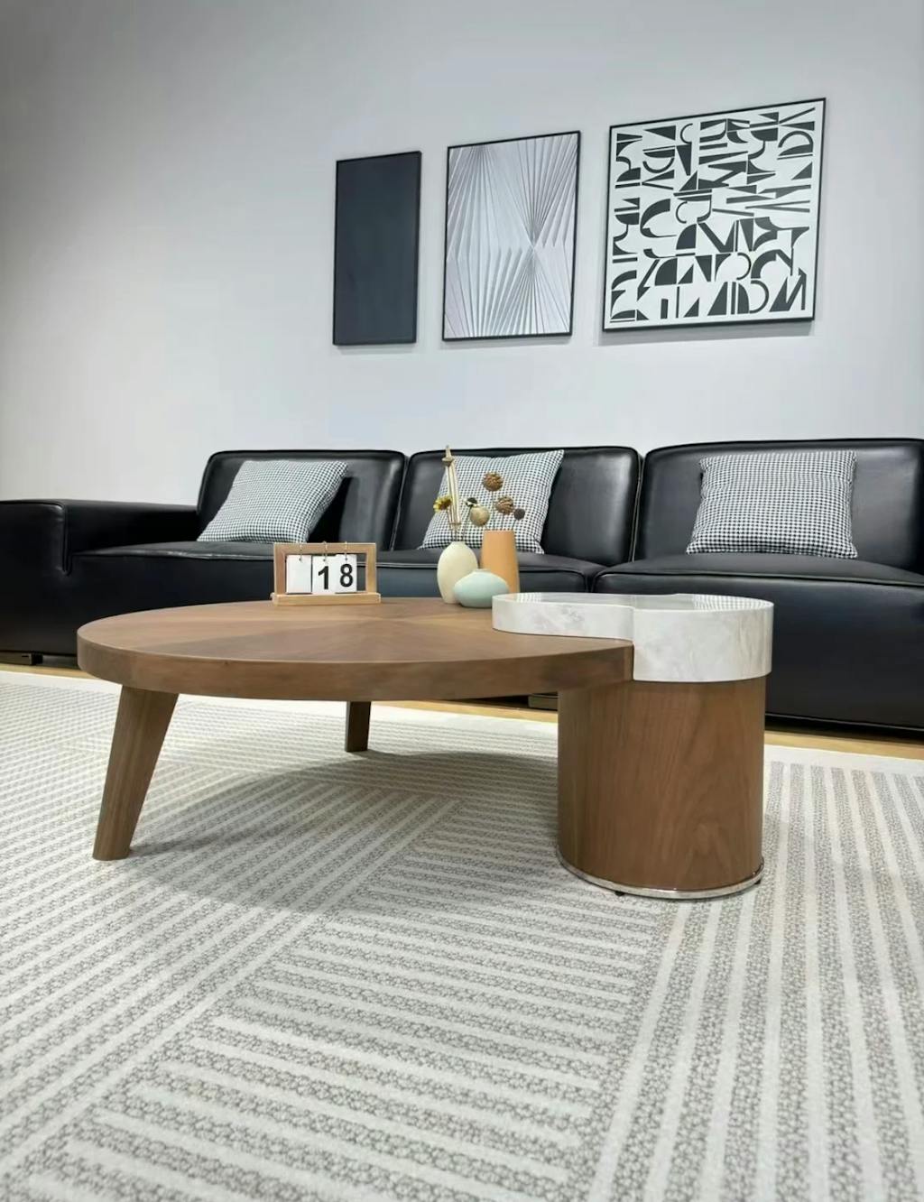 This irregular round coffee table has become a focal point in modern homes, boasting unparalleled charm and functionality. Featuring a clever blend of walnut and marble veneers, it exudes the artistic allure of the coffee table while infusing the living room with a cozy ambiance. Crafted from premium solid wood boards, its sturdiness ensures it can withstand the rigors of daily use, making it a timeless addition to any home.