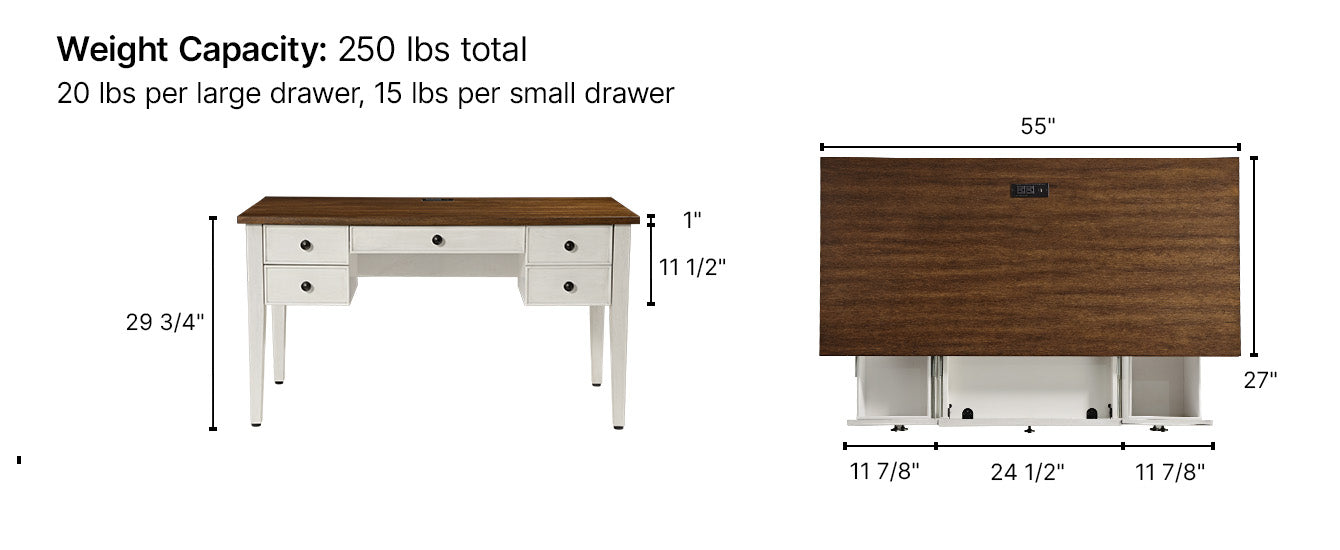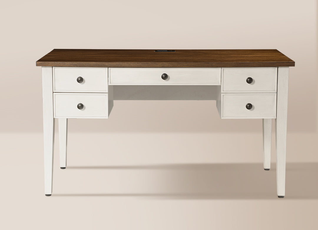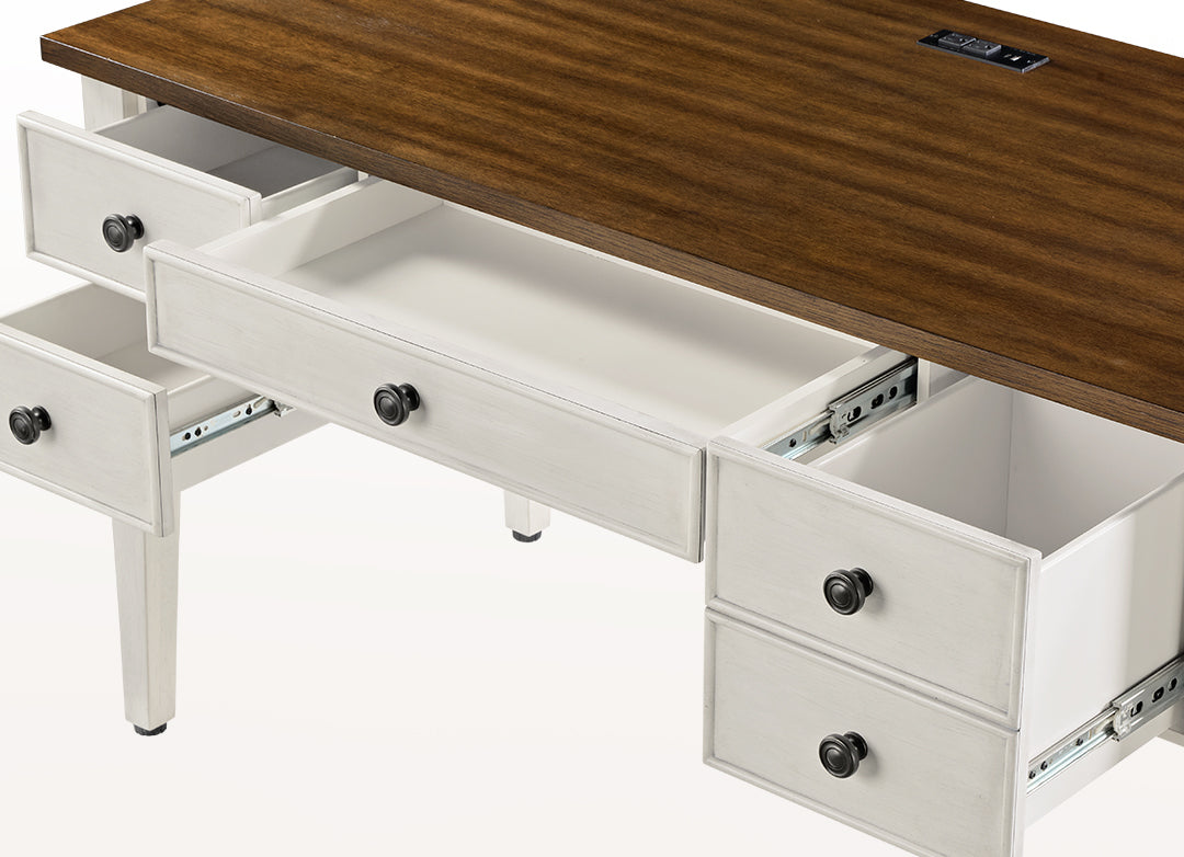 A modern take on a classic, the Farmhouse Writing Desk blends vintage-inspired design with modern conveniences like built-in power. Four drawers provide ample storage for pens, notebooks, and office accessories, keeping your workspace tidy. Plus, with a finished back, you can place it anywhere in the room without compromising style.