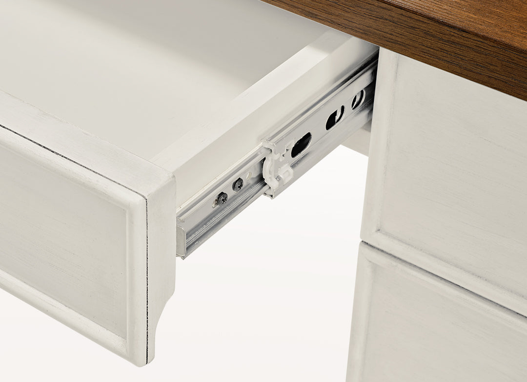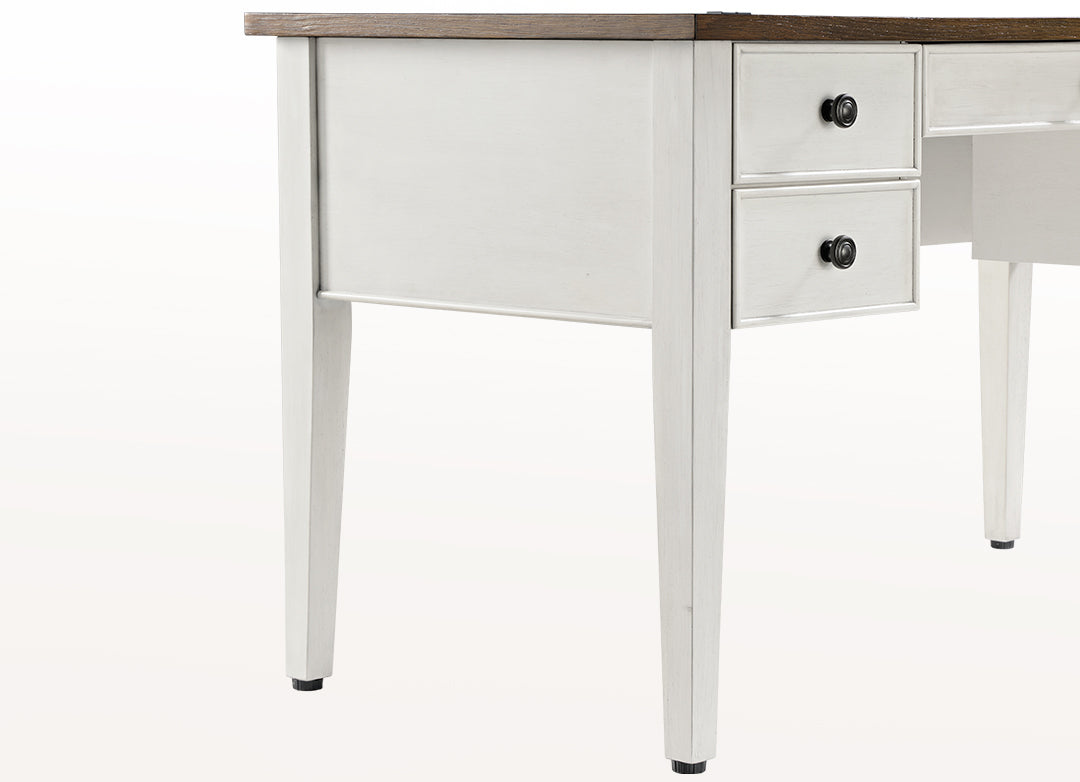 The desk draws inspiration from the quiet beauty of rustic heritage. Its distressed white finish reflects a gentle, time-worn color, evoking a sense of history and warmth. Complementing this, the natural birch wood veneer desktop introduces a touch of color contrast, blending vintage character with modern appeal.