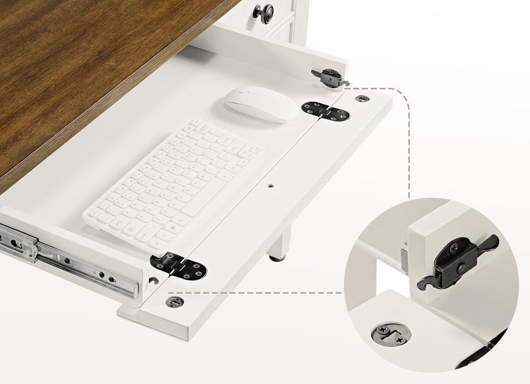 With a simple press of the dual latches inside the drawer, it effortlessly transforms into a keyboard tray, offering a seamless transition between storage and functionality.