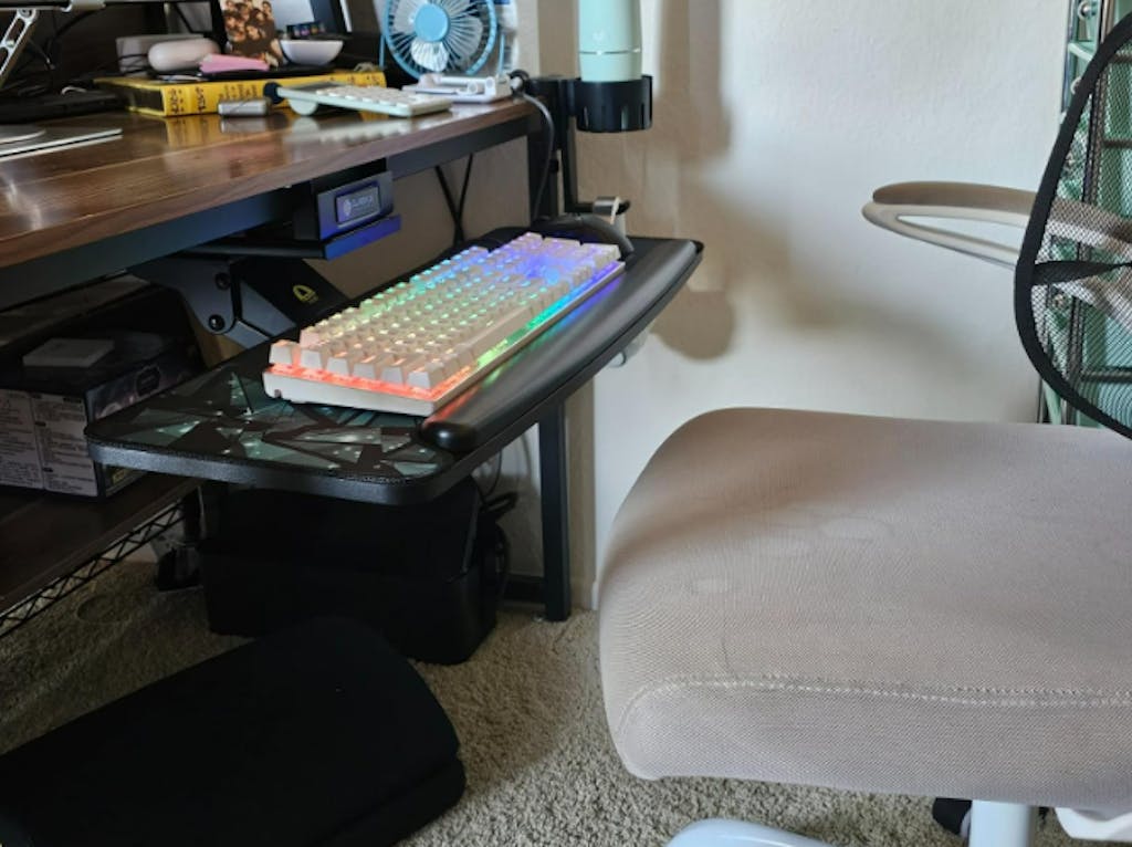 I love how I can rotate the tray a full 360 if I want to tuck it away and use my desk for crafting. It's a bit difficult pulling out and in, but WD-40 solves the problem.