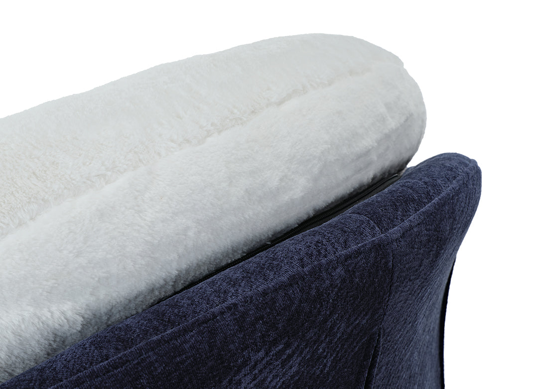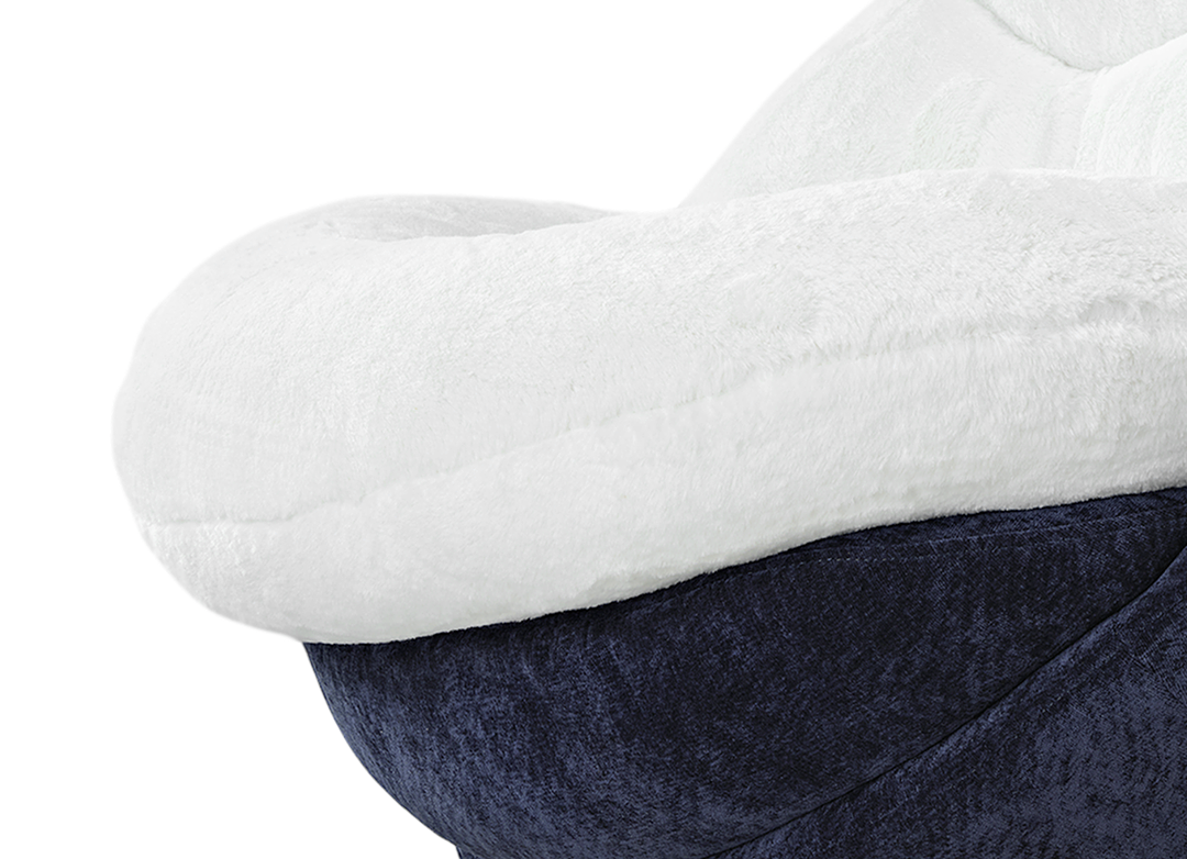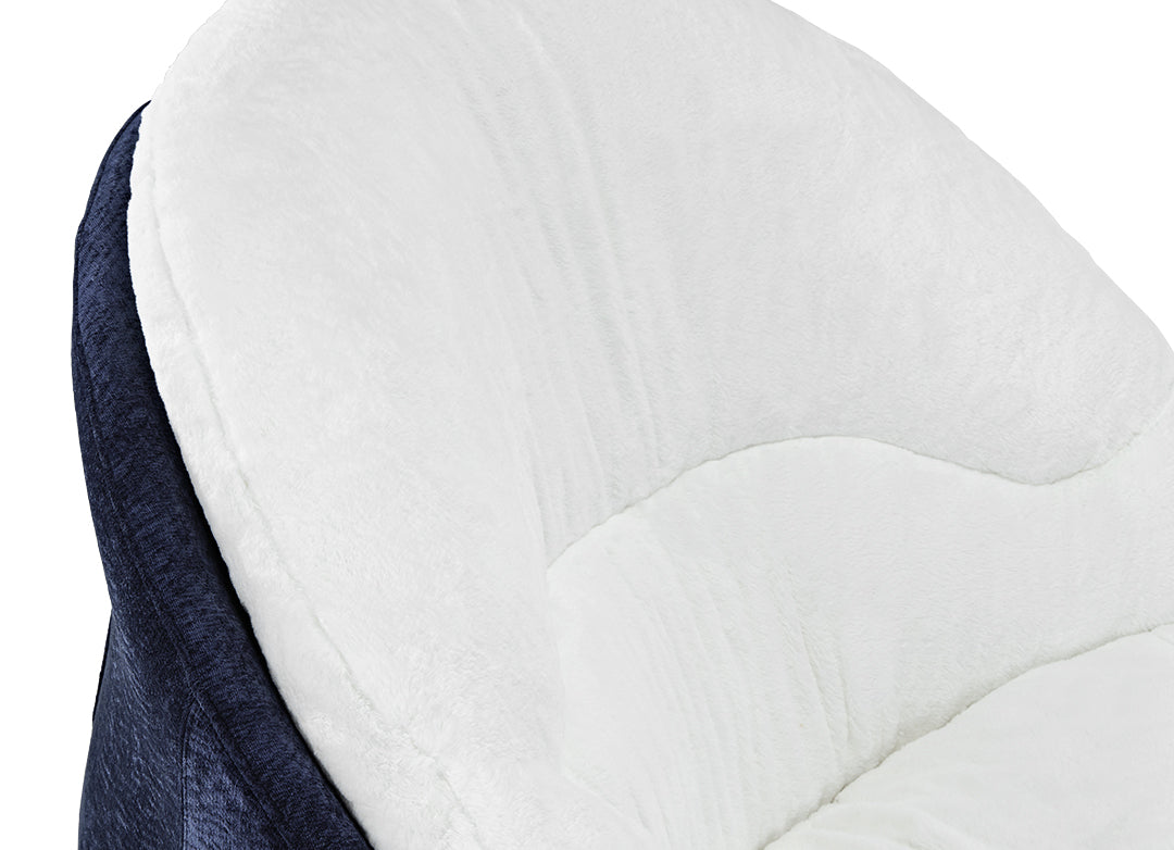 Gloria Swivel Lounge Chair, White Faux Fur Seat and Blue Chenille Backrest.