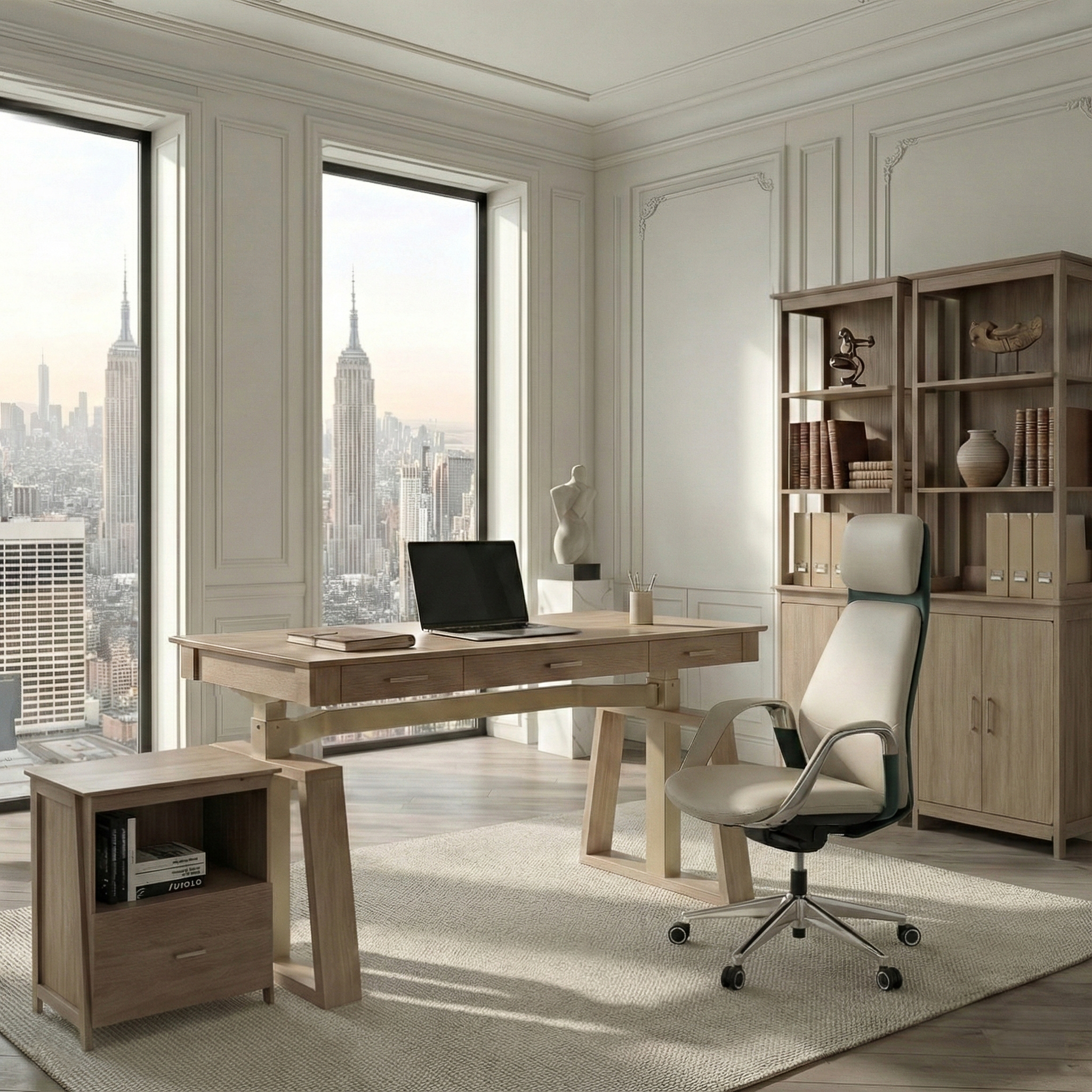 A light-oak office ensemble designed to bring warmth, calm, and effortless harmony to your workspace.Soft neutral tones and gently contoured forms create an inviting atmosphere that supports focus and ease throughout the day.With thoughtful storage and ergonomic seating, the set transforms your home office into a refined, welcoming space made for everyday flow.