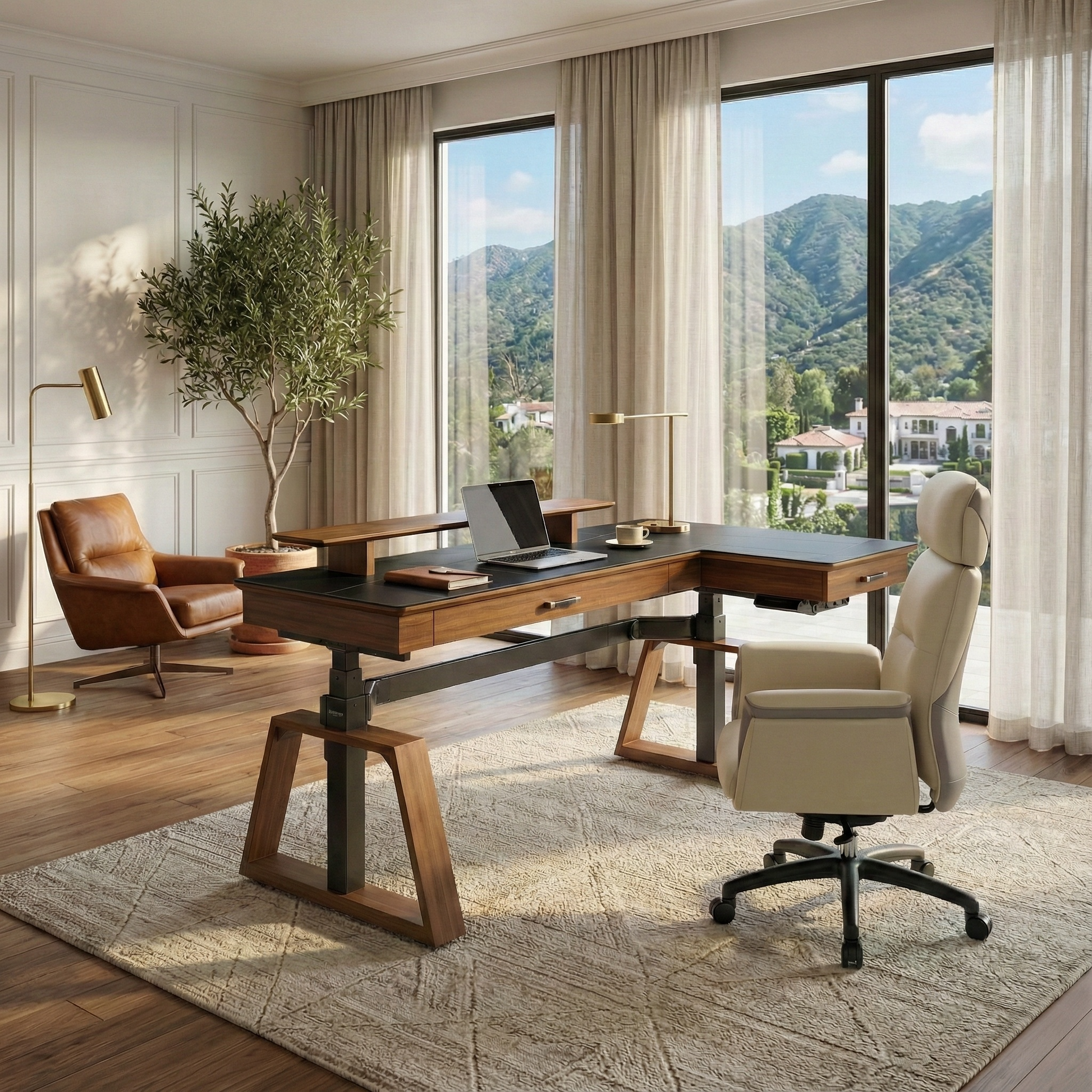 This premium office set features the versatile Ark Pro L-Shaped Standing Desk, complemented by your choice of two Napa leather executive chairs—Mathias or Serene. The desk offers a durable sintered stone surface, smooth height adjustments, and ample storage, while both chair options provide luxurious comfort with sculpted support and sleek designs. Together, they create a refined workspace that combines modern functionality with timeless elegance.