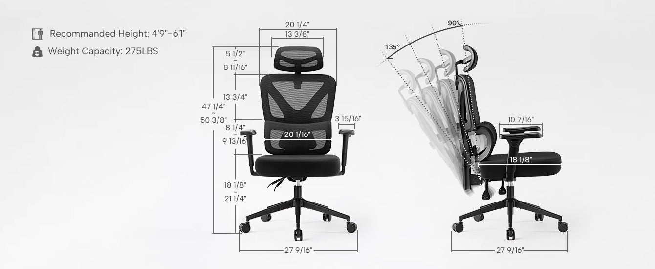 • Reclining Function: With a tilt range of 90°–135°, the chair provides flexible recline angles for working, reading, or relaxing.