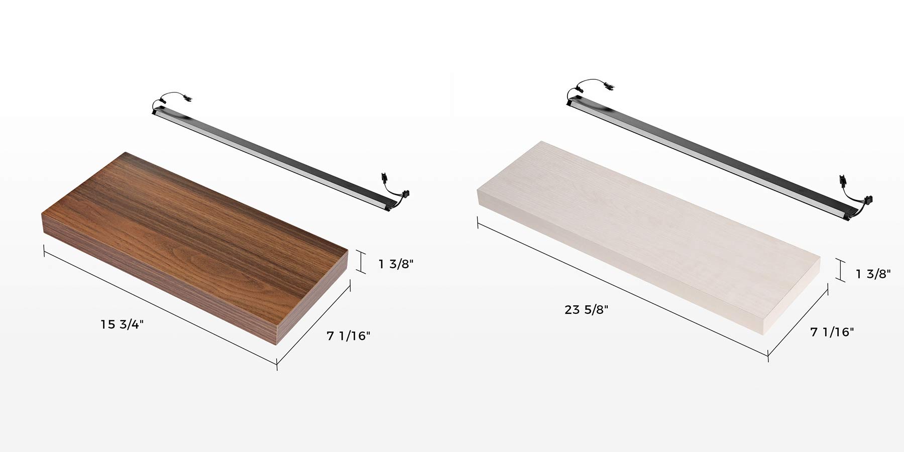 Nice, floating shelves with lights. I like the walnut color. That’s plenty enough room for books or decorative bottles and most other things that you can want to put on floating shelves.