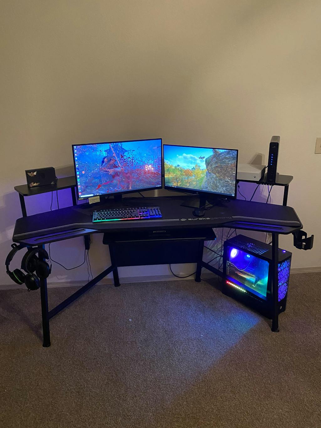 I'm sure you could put your PC on the desk but I've got a hoss so it sits under the desk. I've got one 27鈥?and one 24鈥?monitor and they have to sit in front the the shelves to fit. And that's fine for now. I'm sure if I get the dual monitor stand I can sit two 27鈥?monitor and have my Xbox and Switch on the shelves in full view.