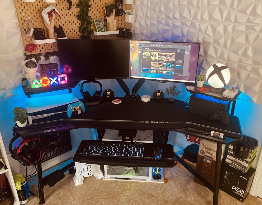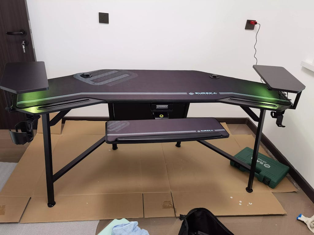 Great build quality, lots of space and the lights are an awesome touch! I'd recommend using a drill if you have one, it made assembly much easier. Take an extra moment reading the instructions, and look for the numbers on the bags. The slots on either side hold my S22 Ultra and remotes. Keyboard tray makes typing easy.