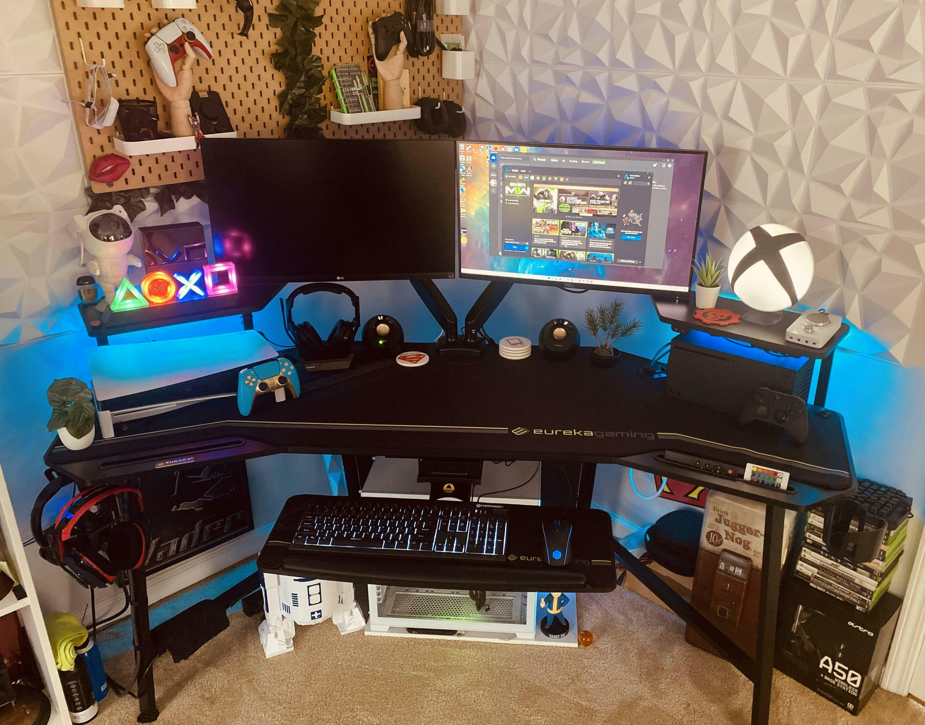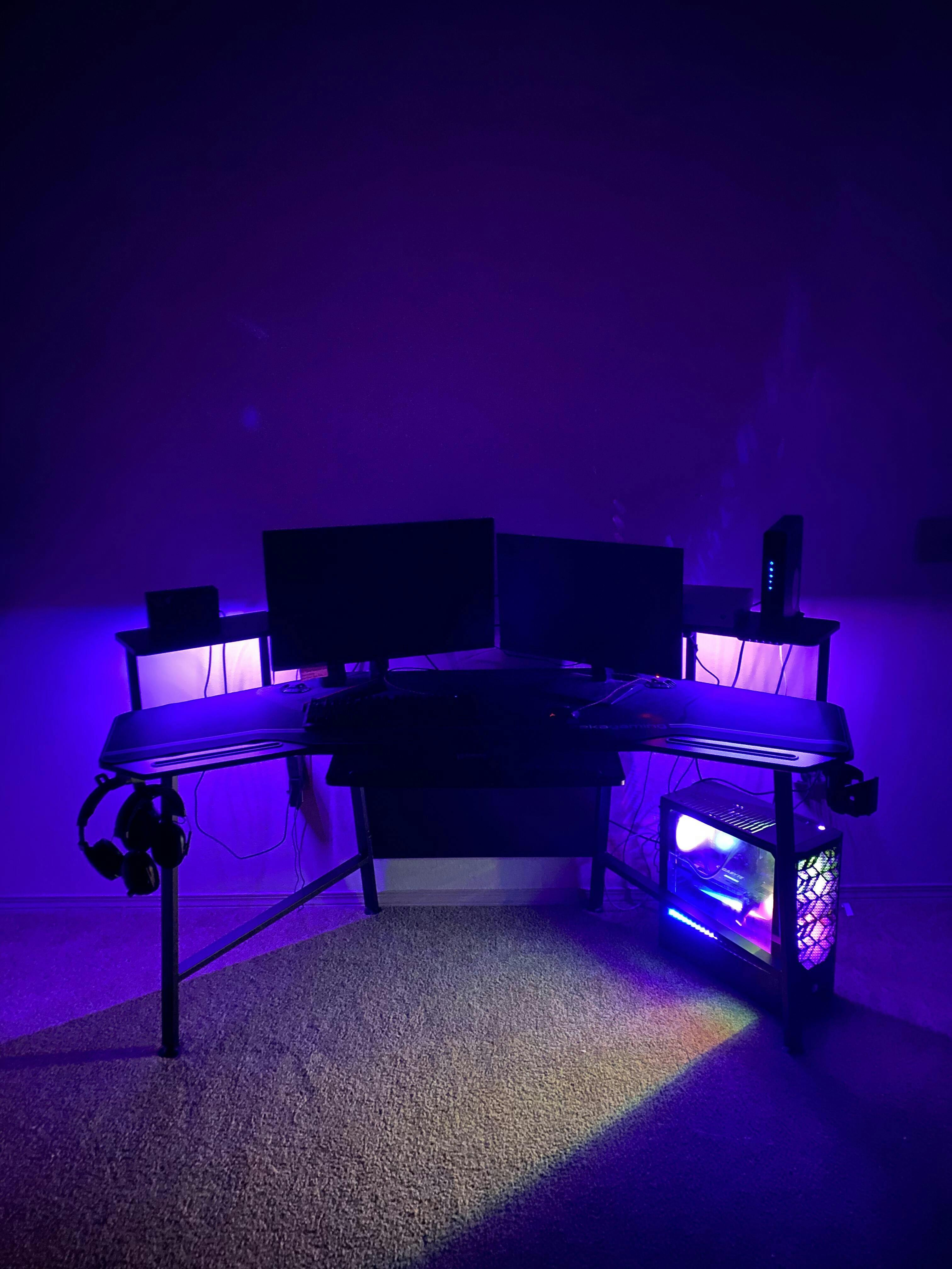 I'm sure you could put your PC on the desk but I've got a hoss so it sits under the desk. I've got one 27鈥?and one 24鈥?monitor and they have to sit in front the the shelves to fit. And that's fine for now. I'm sure if I get the dual monitor stand I can sit two 27鈥?monitor and have my Xbox and Switch on the shelves in full view.