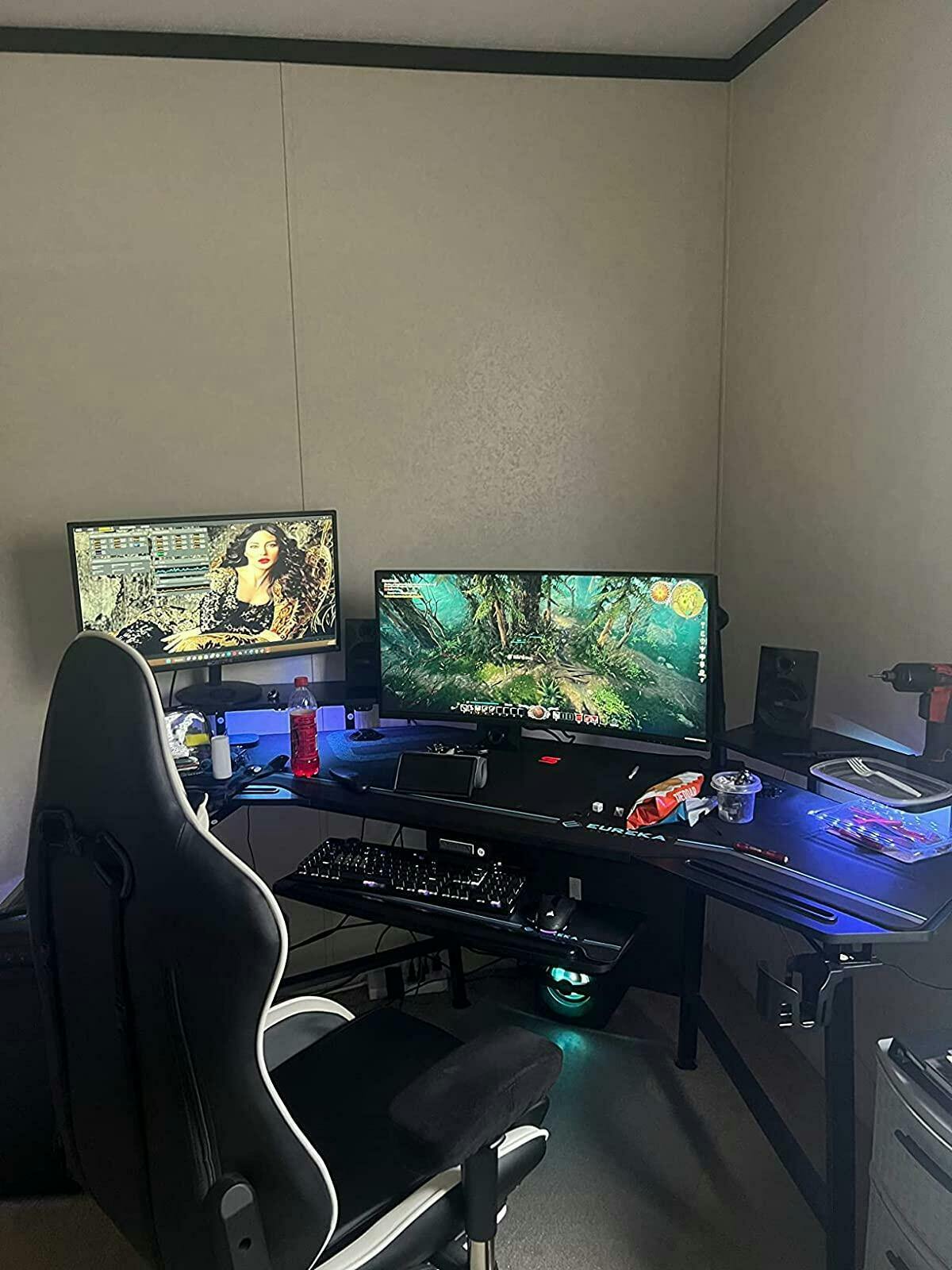 Great build quality, lots of space and the lights are an awesome touch! I'd recommend using a drill if you have one, it made assembly much easier. Take an extra moment reading the instructions, and look for the numbers on the bags. The slots on either side hold my S22 Ultra and remotes. Keyboard tray makes typing easy.