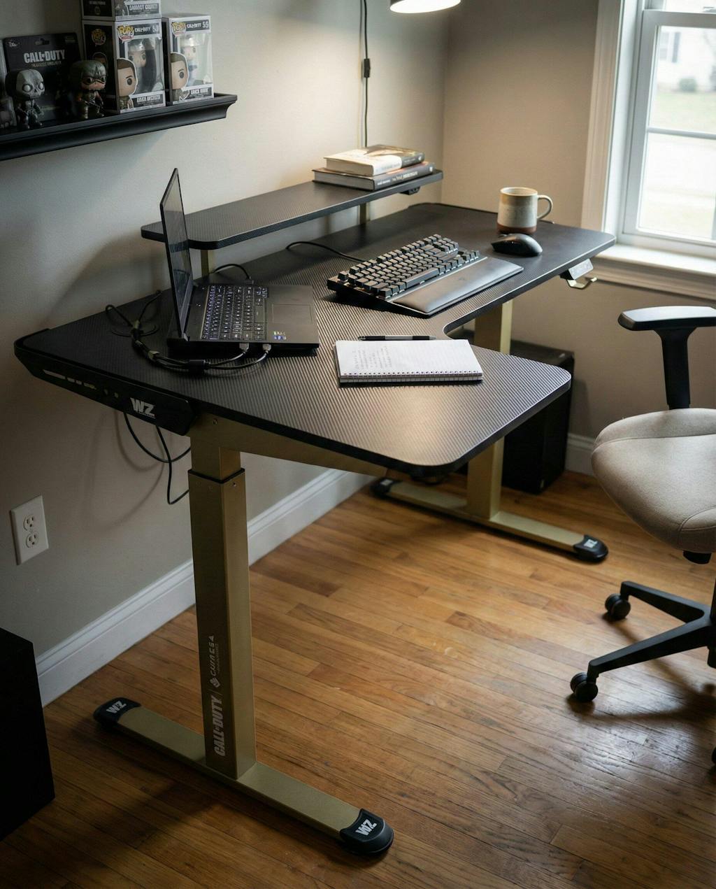 Eureka × Call of Duty® Official Co-branded Gaming Standing Desk with Gaming Accessories Set. Elevate your gaming room with our Officially Licensed Call of Duty® Standing Desk. With wood top and alloy steel base, adjustable height (29.5"-48.06"). Get Ready to conquer with style!
