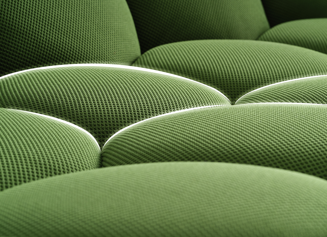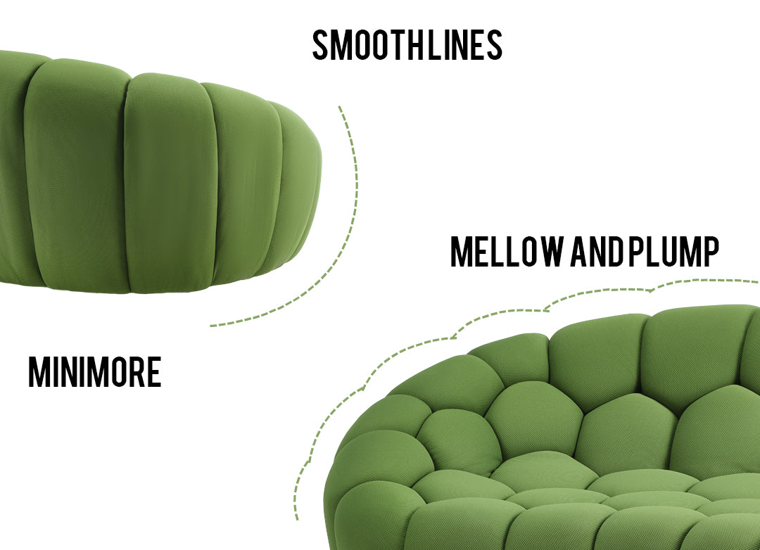 A soft and vibrant rounded shape, brimming with playfulness, offers a comfortable and uniquely appealing ergonomic sofa design.